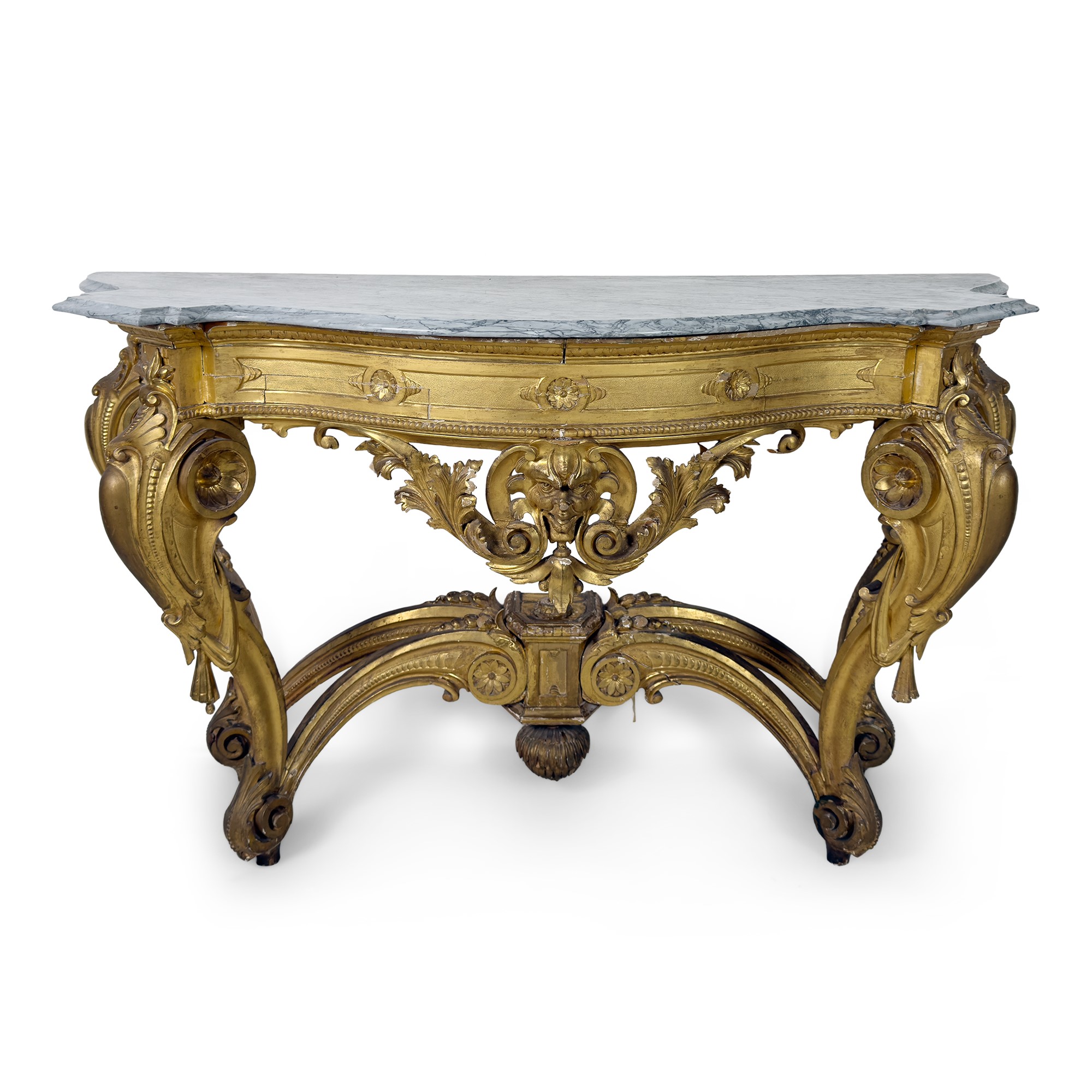 di forma concava e convessa; fascia sottostante il piano centrata da un mascherone antropomorfo scolpito e traforato; gambe a voluta riunite al centro da quattro traverse a rocailles trattenenti un elemento geometrico; piano di marmo grigio, cm. 102x150x64 (difetti)