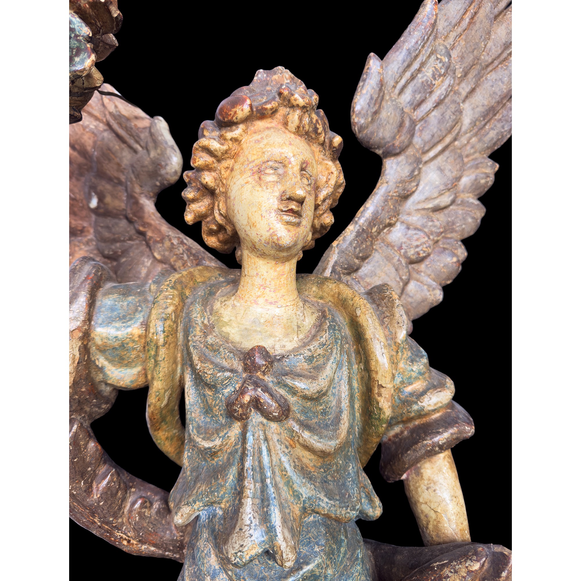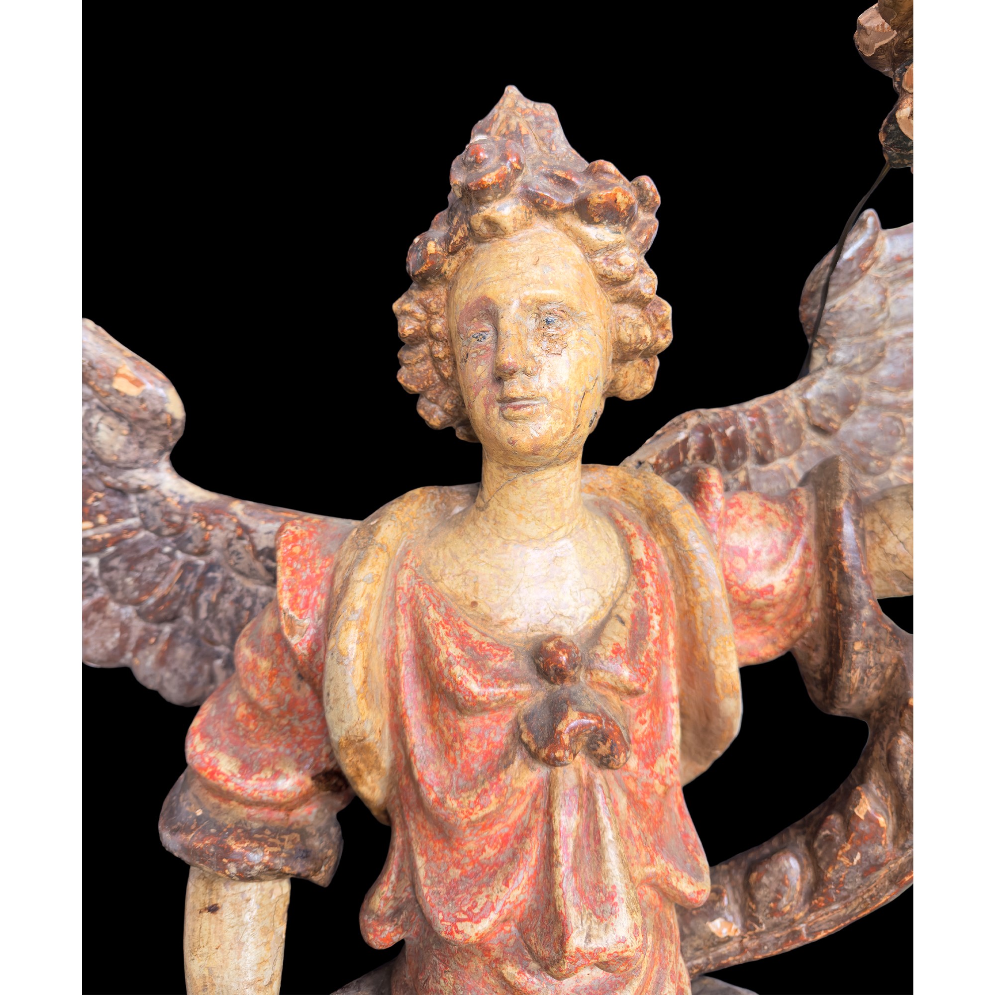 Coppia di angeli reggitorcia in legno policromo e dorato, XVIII secolo