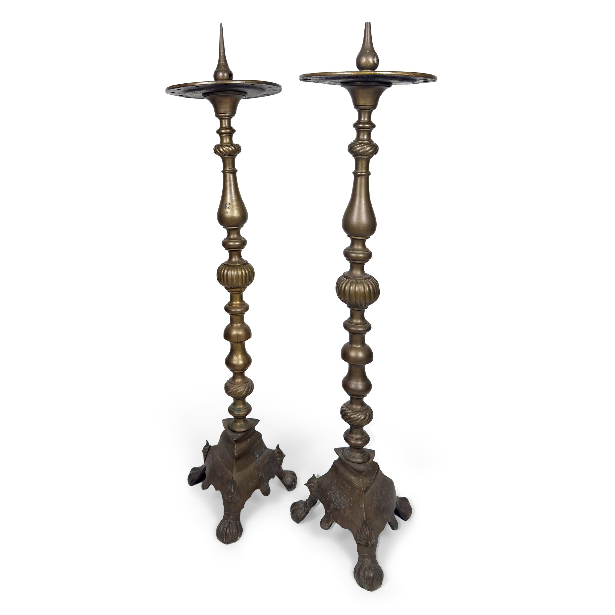 Coppia di antichi torceri di bronzo patinato