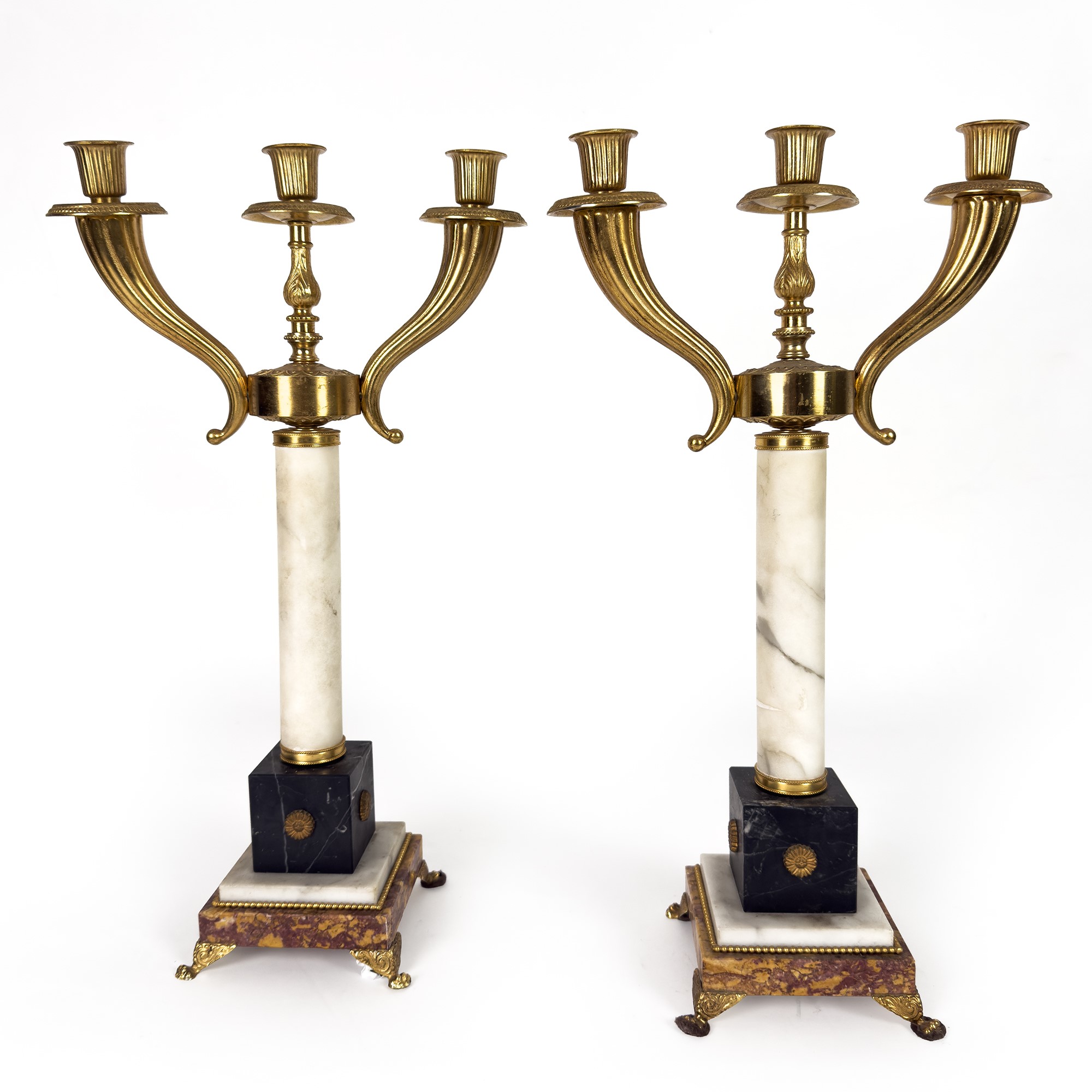 Coppia di candelabri a tre luci in metallo dorato e marmi policromi