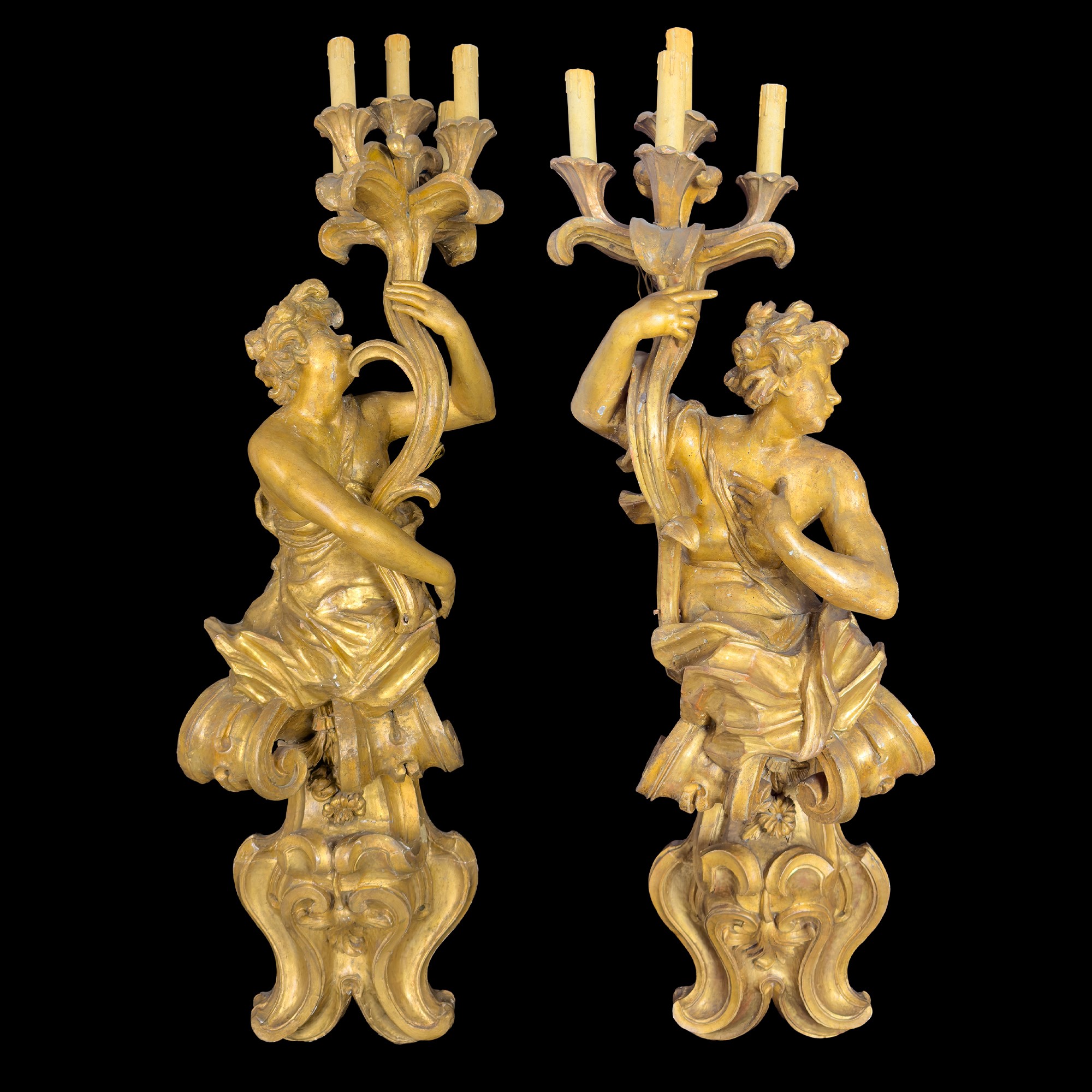 Coppia di importanti flambeaux da muro in legno dorato, Roma, seconda metà del XVII secolo