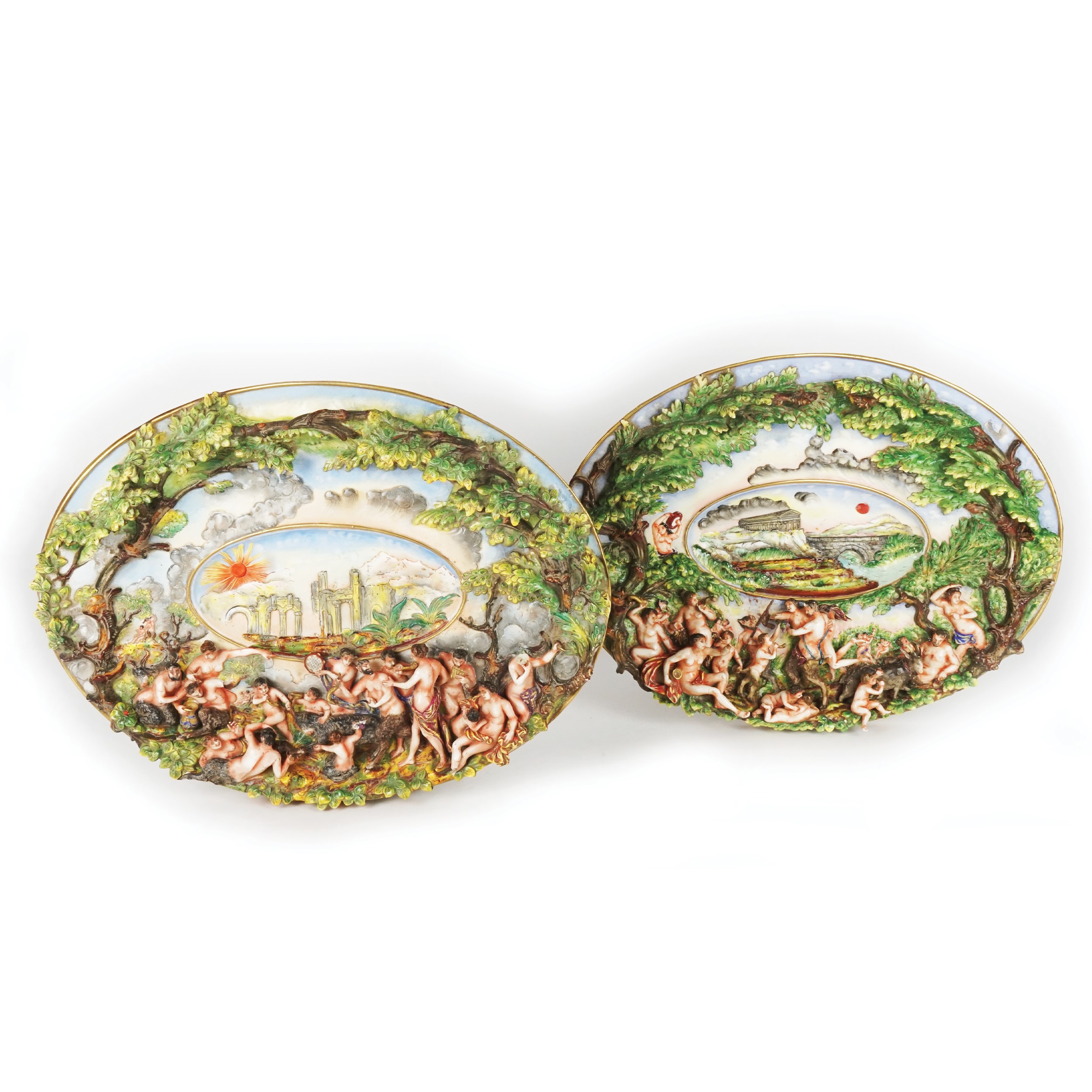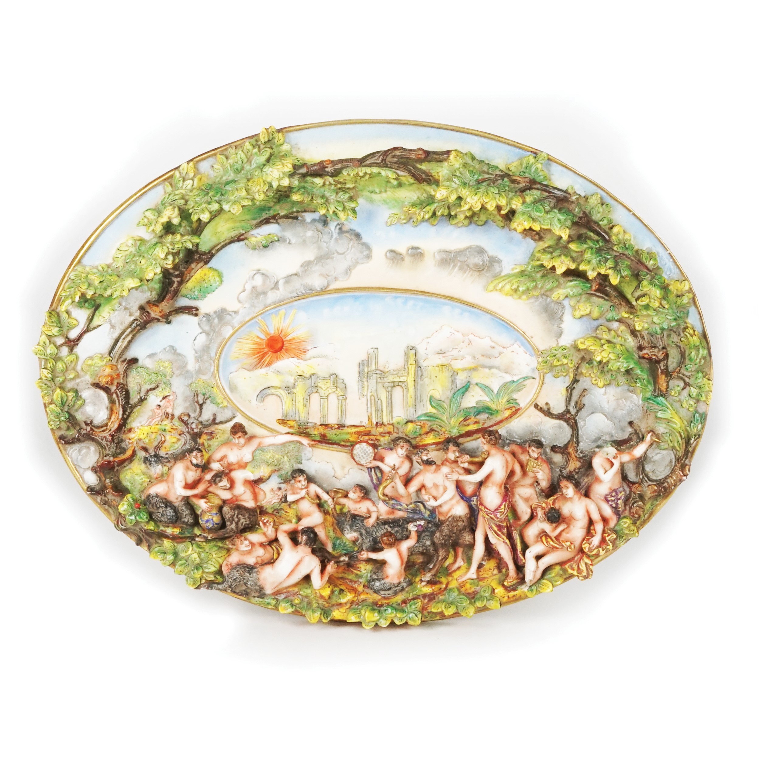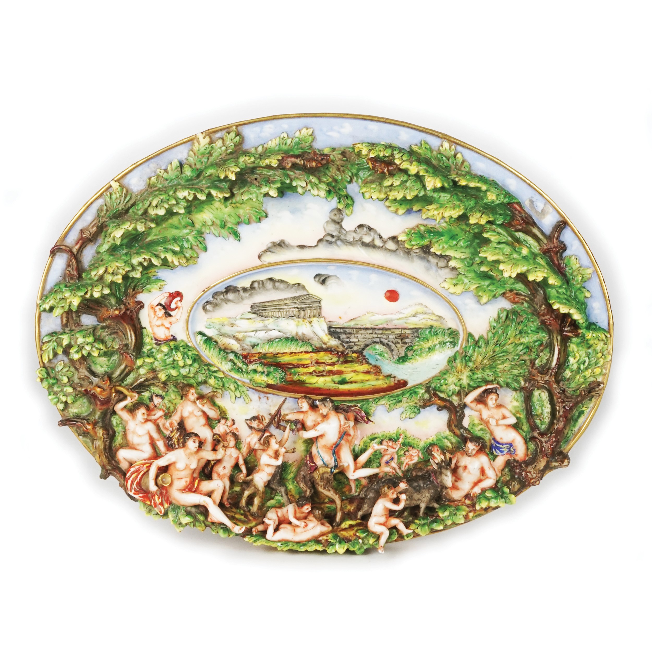 di forma ovale, il cavetto centrato da un paesaggio con ruderi e tempio; la tesa รจ caratterizzata da una moltitudine di satiri e ninfe sotto alberi fronduti, rese in forte rilievo, cm. 30x40 (mancanze)