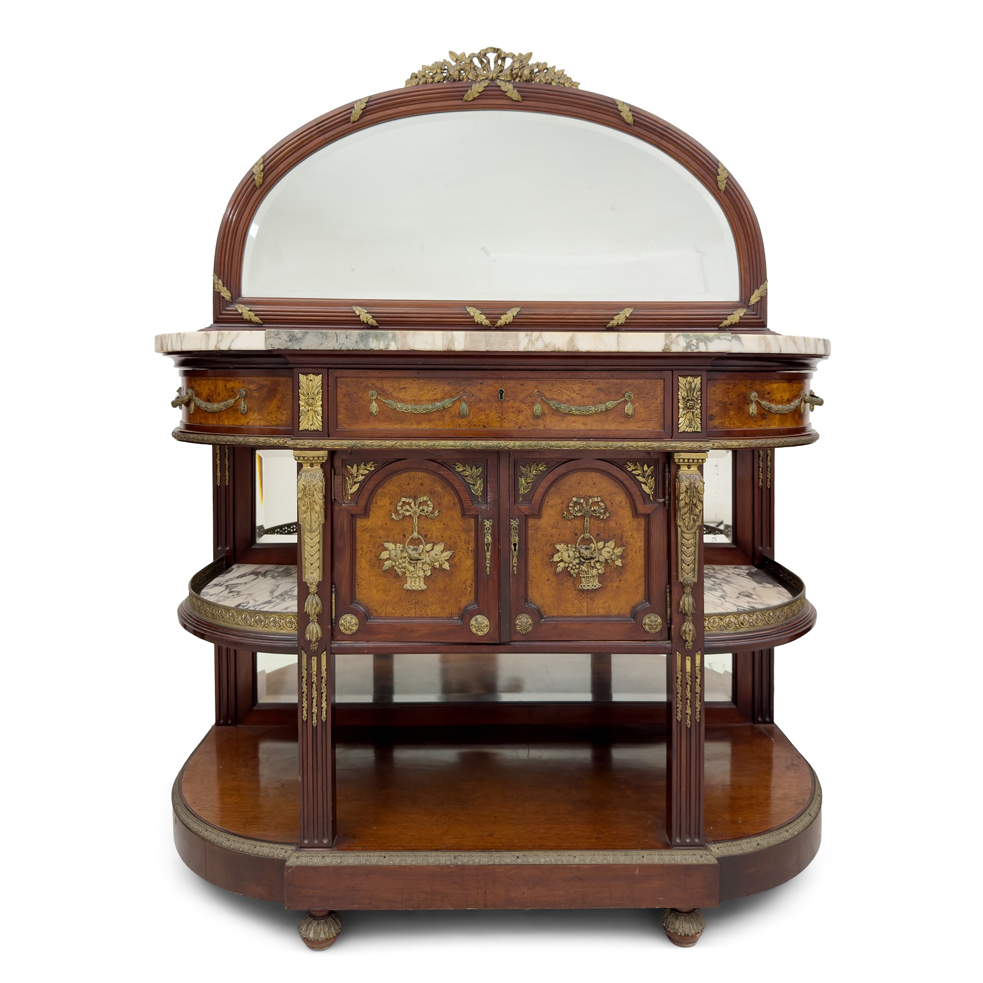 impiallacciata in noce e radica. Fronte a tre cassetti sovrastanti due portine e vani a giorno; piano in marmo bianco venato; fianchi arrotondati; applicazioni in metallo dorato di gusto neoclassico finemente cesellato, complessivamente cm. 164x131x55,5 (qualche difetto)