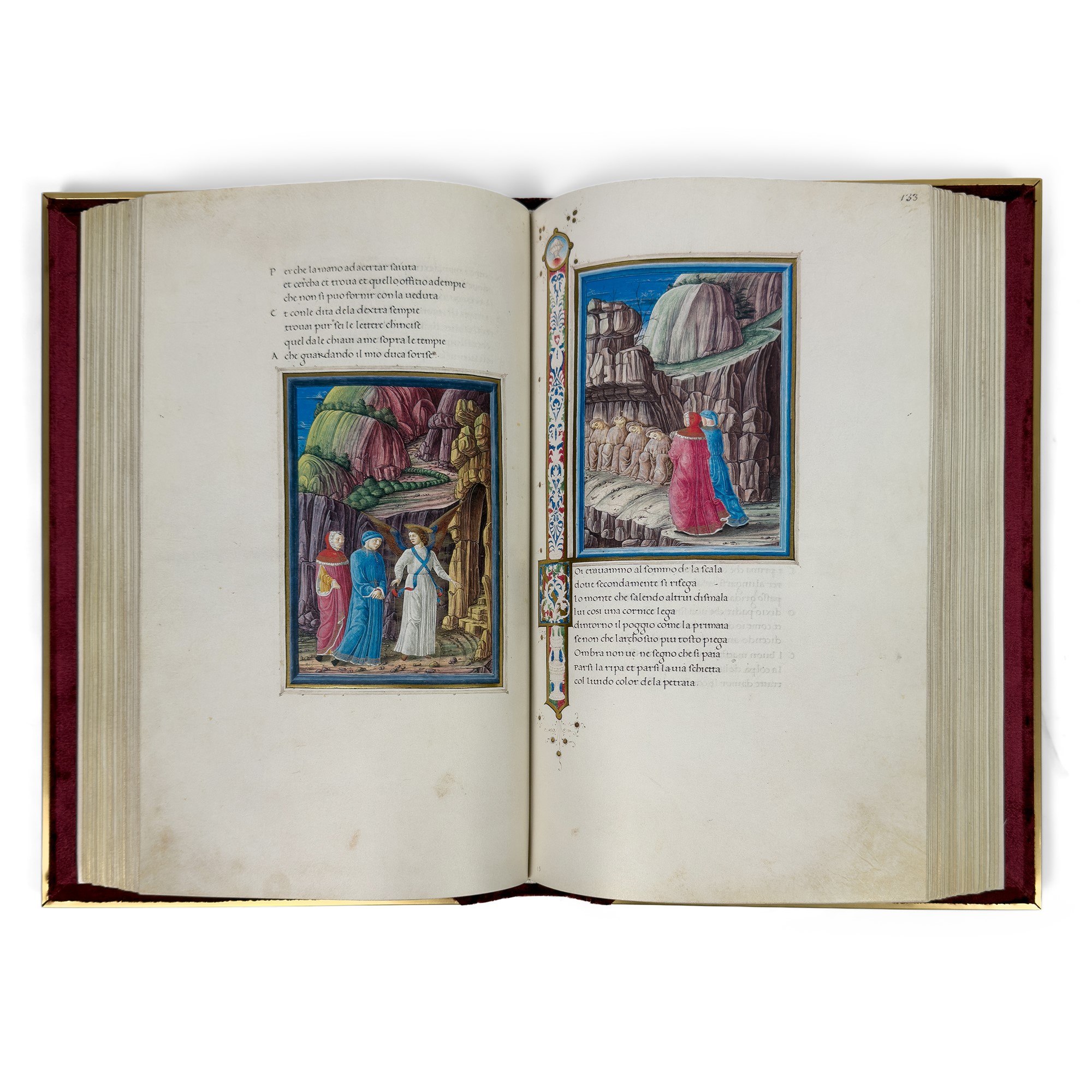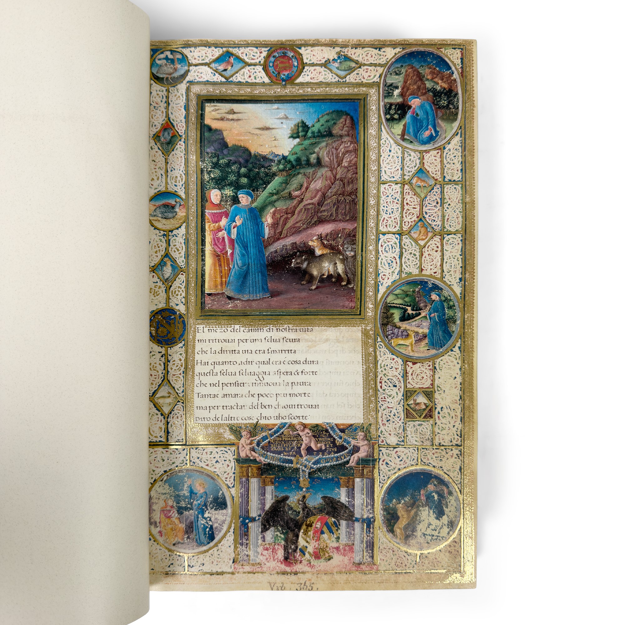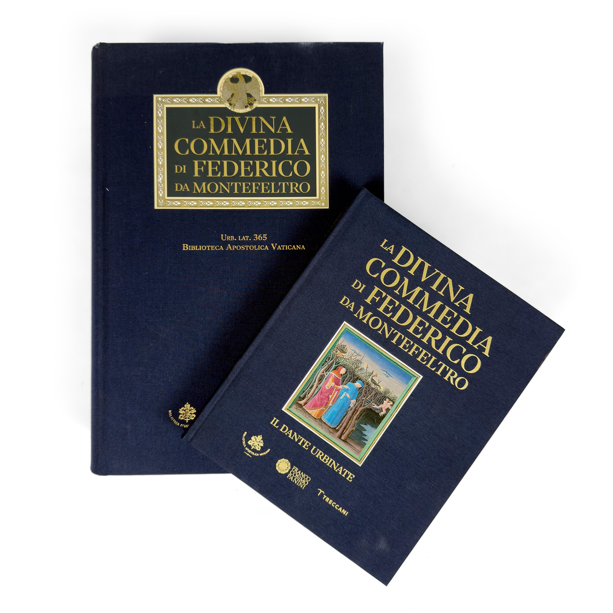Riproduzione in facsimile del manoscritto miniato realizzato per il duca Federico da Montefeltro della biblioteca Apostolica Vaticana, ms. urbinate 365. Leg. edit. in velluto rosso con decorazioni dorate ai piatti. Un volume di cm. 27x42 di pp. 594 dentro custodia in tela e un volume di commento a cura di d'Ambrogio Pizzoni.