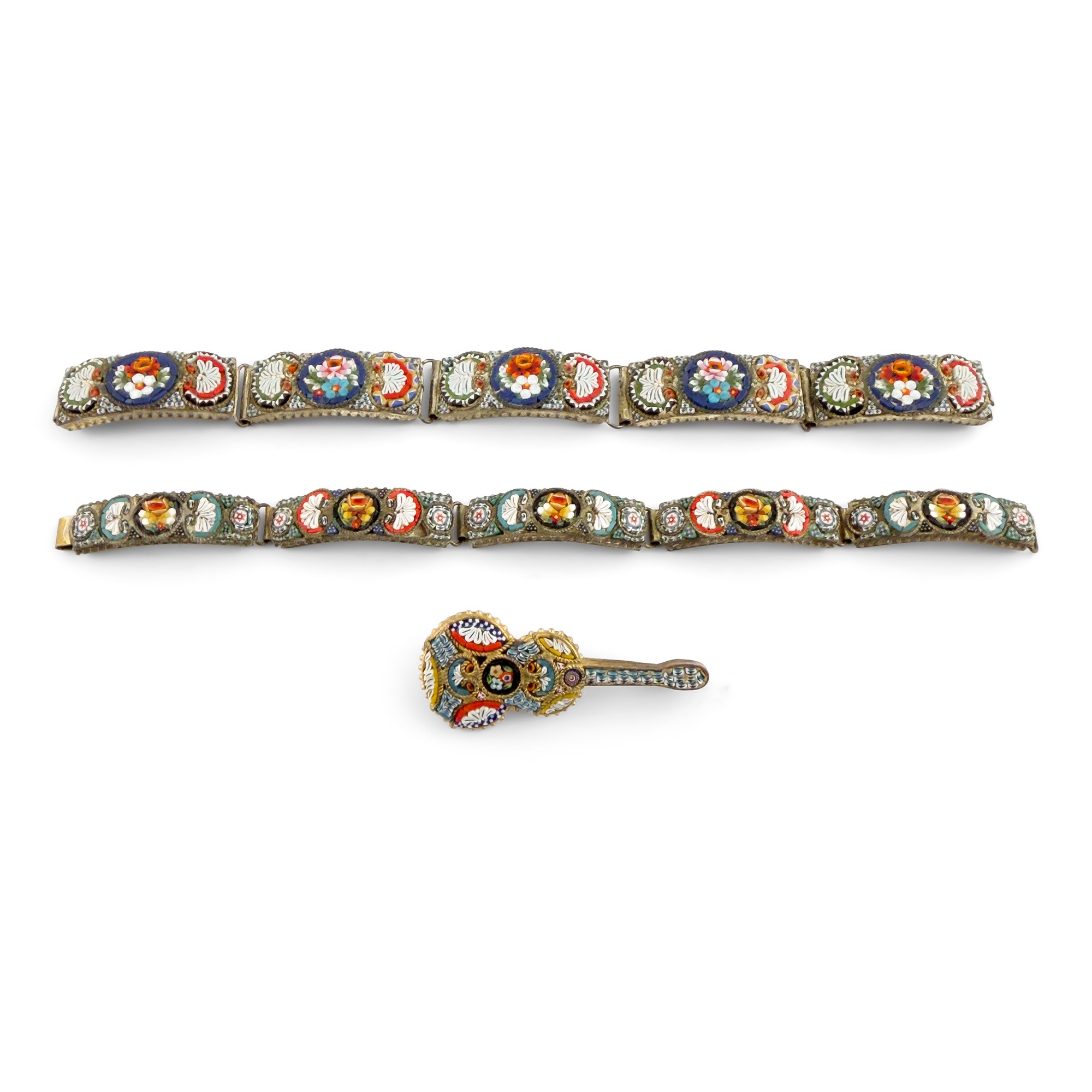 i bracciali: l. cm. 18 e l. cm. 19; la spilla in forma di chitarra, cm. 5