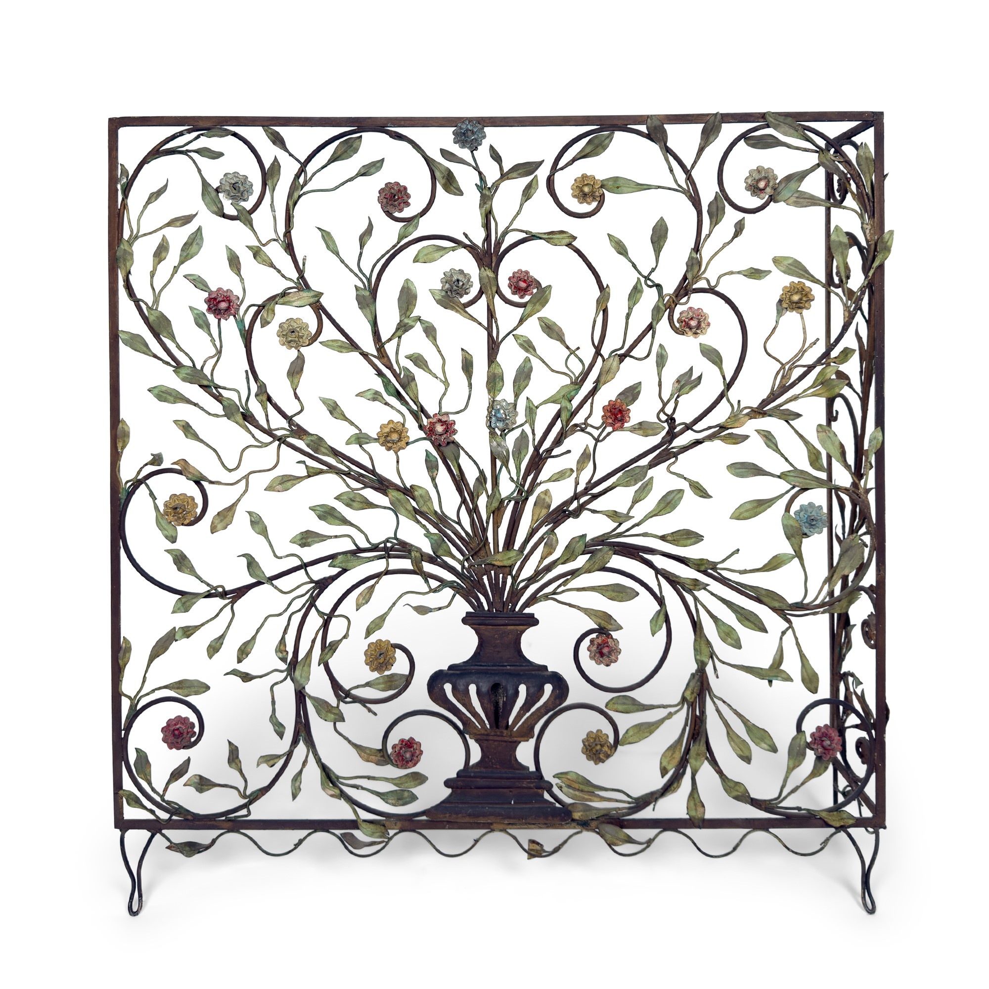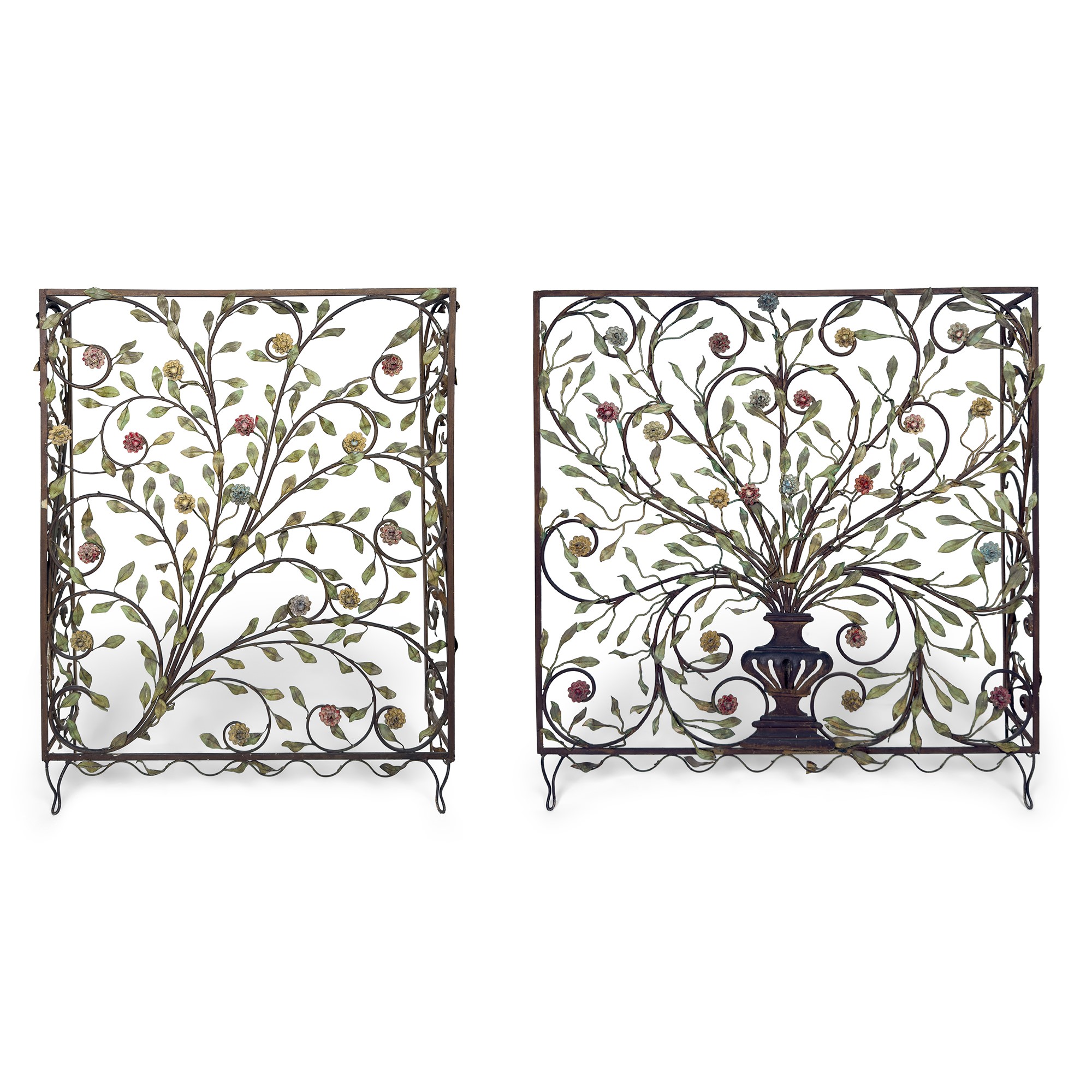 decorati rispettivamente a vaso traboccante foglie e ramo di fiori e foglie, cm. 122x116x22,5 (mancante di un fianco) e cm.118x93x22,5