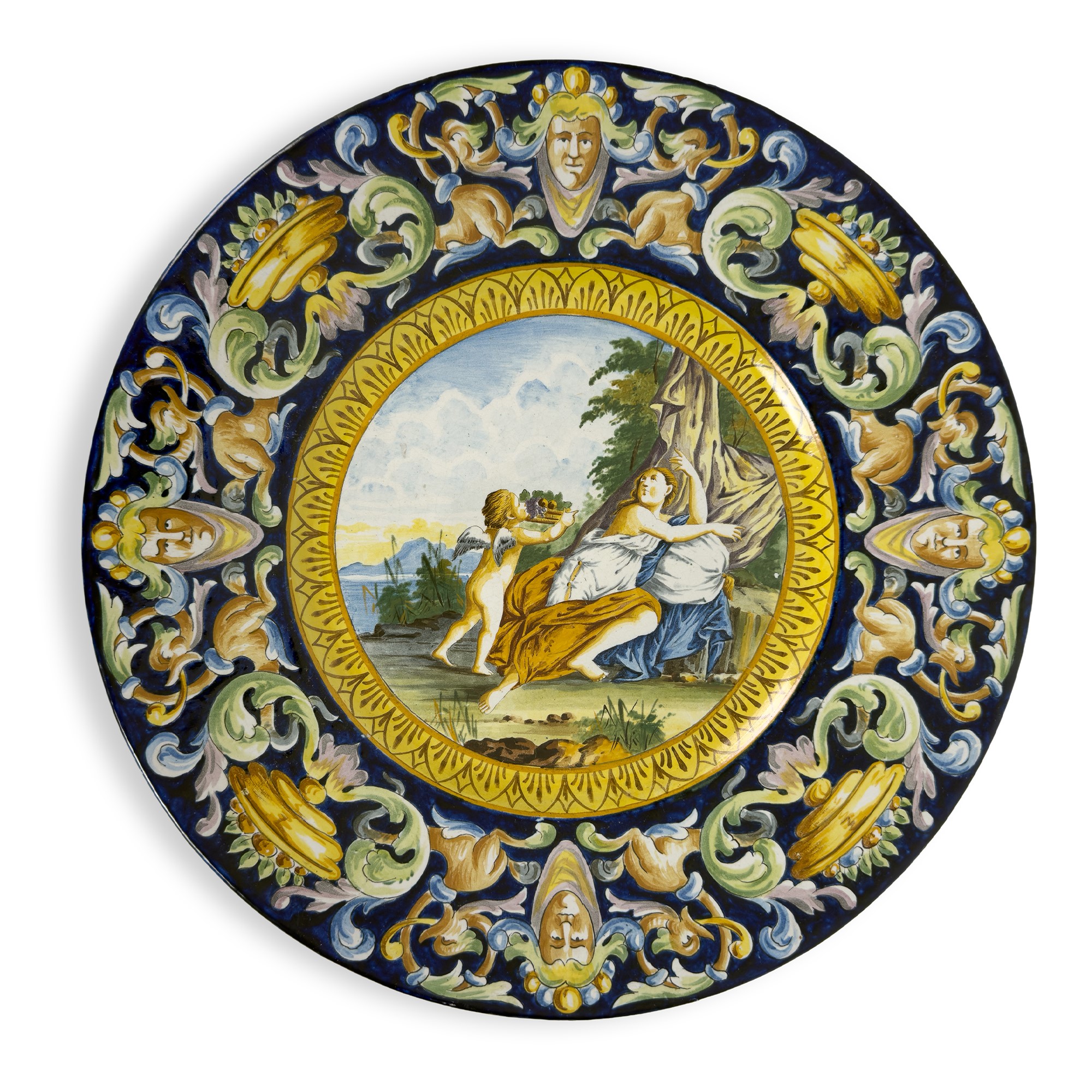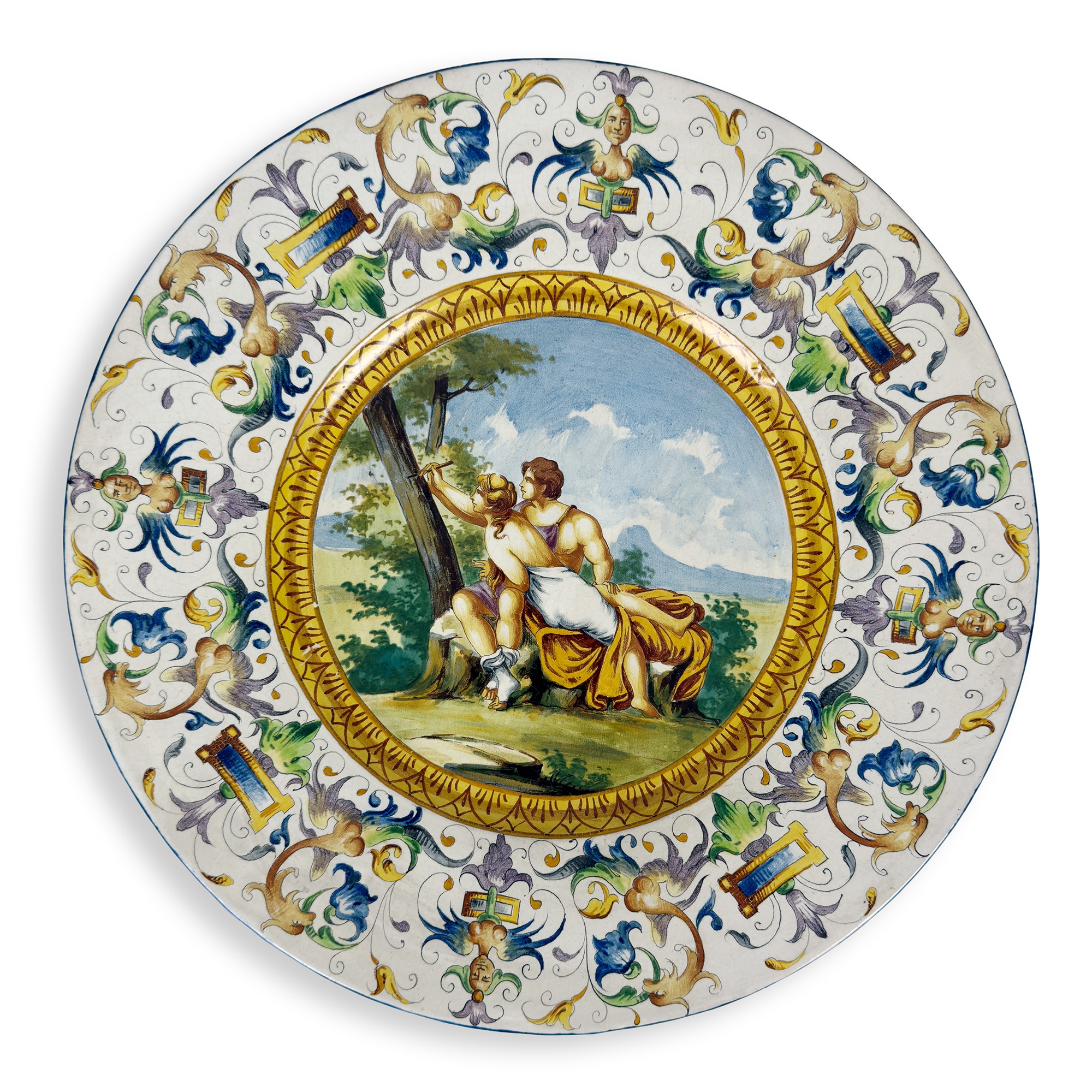 tesa dipinta a raffaellesche; nel cavetto rispettivamente una scena mitologica e una scena pastorale, d. cm. 45