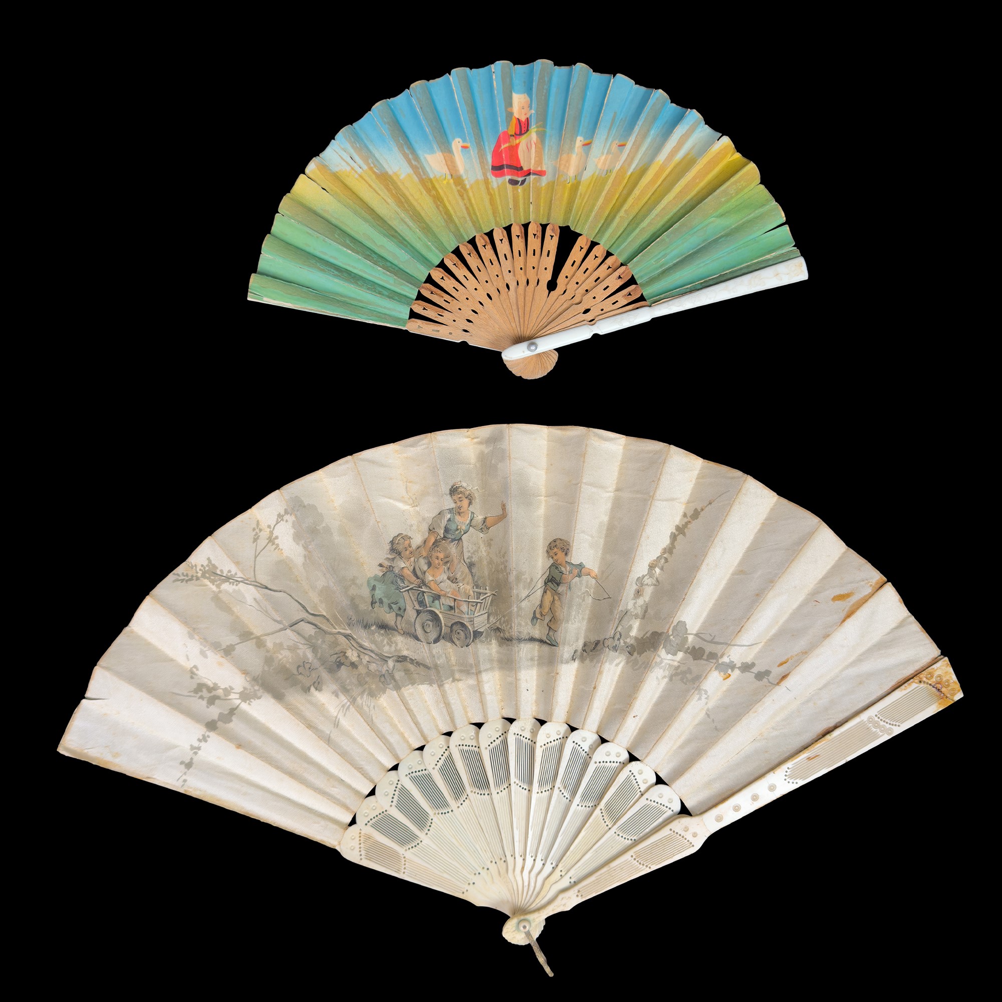 decorati rispettivamente a scena con bimbi che giocano e a figura di olandesina, il ventaglio piรน grande: l. cm. 49 difetti)