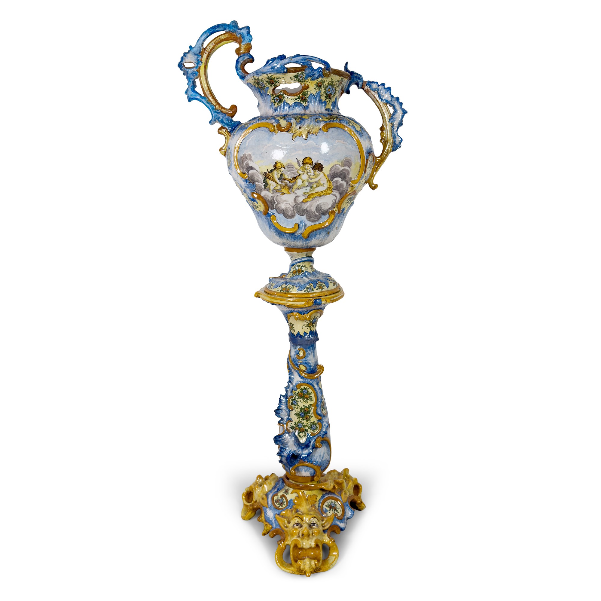 ornato sul corpo a raffigurare due riserve contrapposte ciascuna contenente una scena di battaglia opposta a tre amorini colti in diversi atteggiamenti; due anse a voluta sfalzata. Il vaso poggia su un'alta colonna anch'essa in maiolica con tre piedi a mascherone antropomorfo, complessivamente h. cm. 163,5