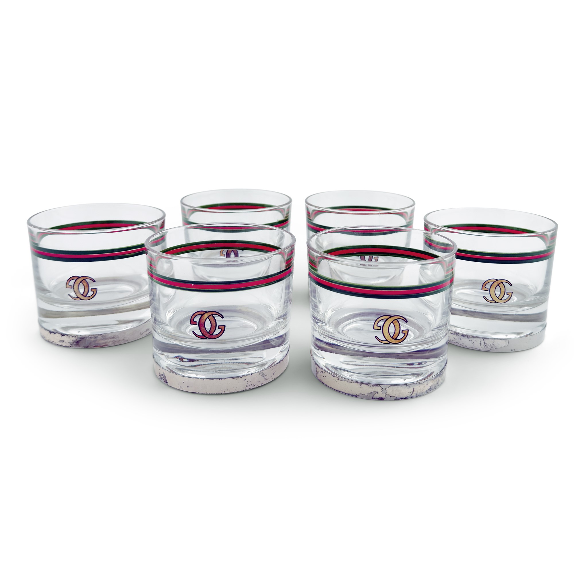 Sei bicchieri da whisky in vetro logato con montatura in metallo cromato (cromatura consunta)