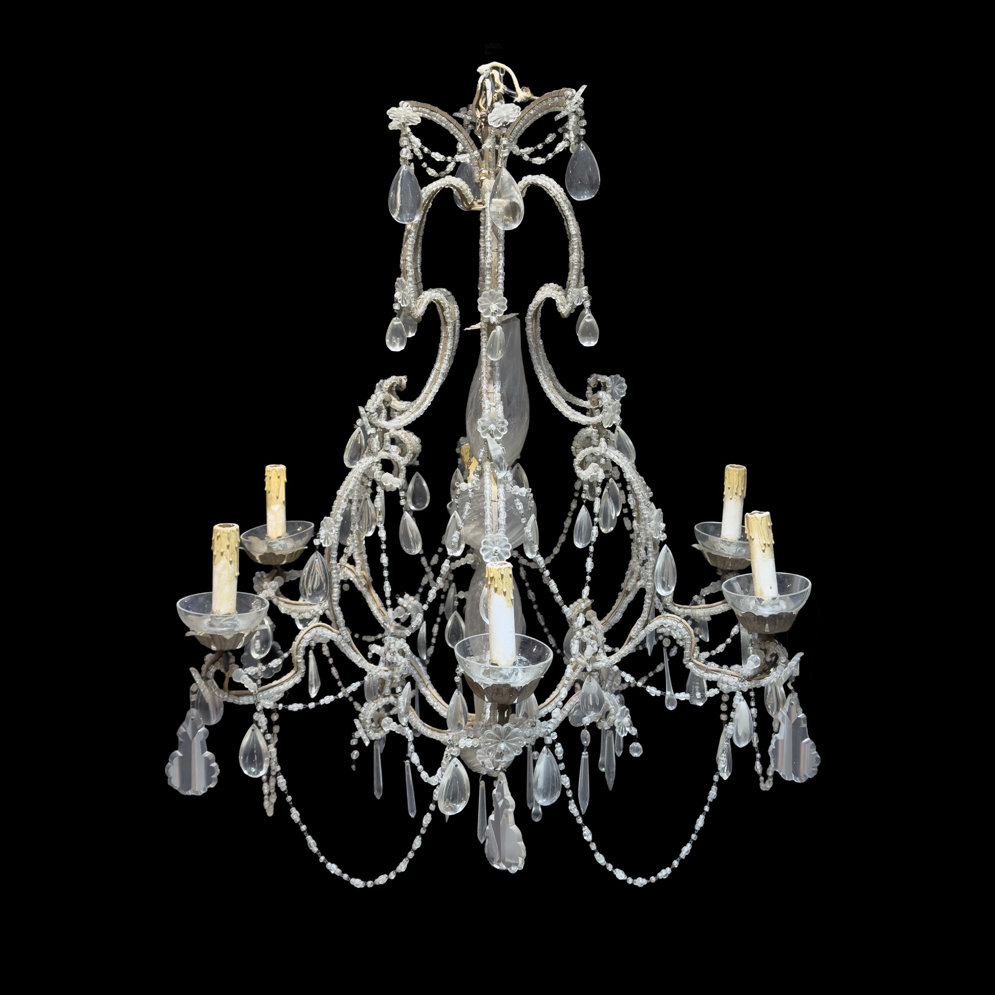 interamente percorsa da perline, arricchita da pendenti a goccia; stelo a balaustro formato da elementi tortili in vetro, cm. 100x80 circa (difetti)