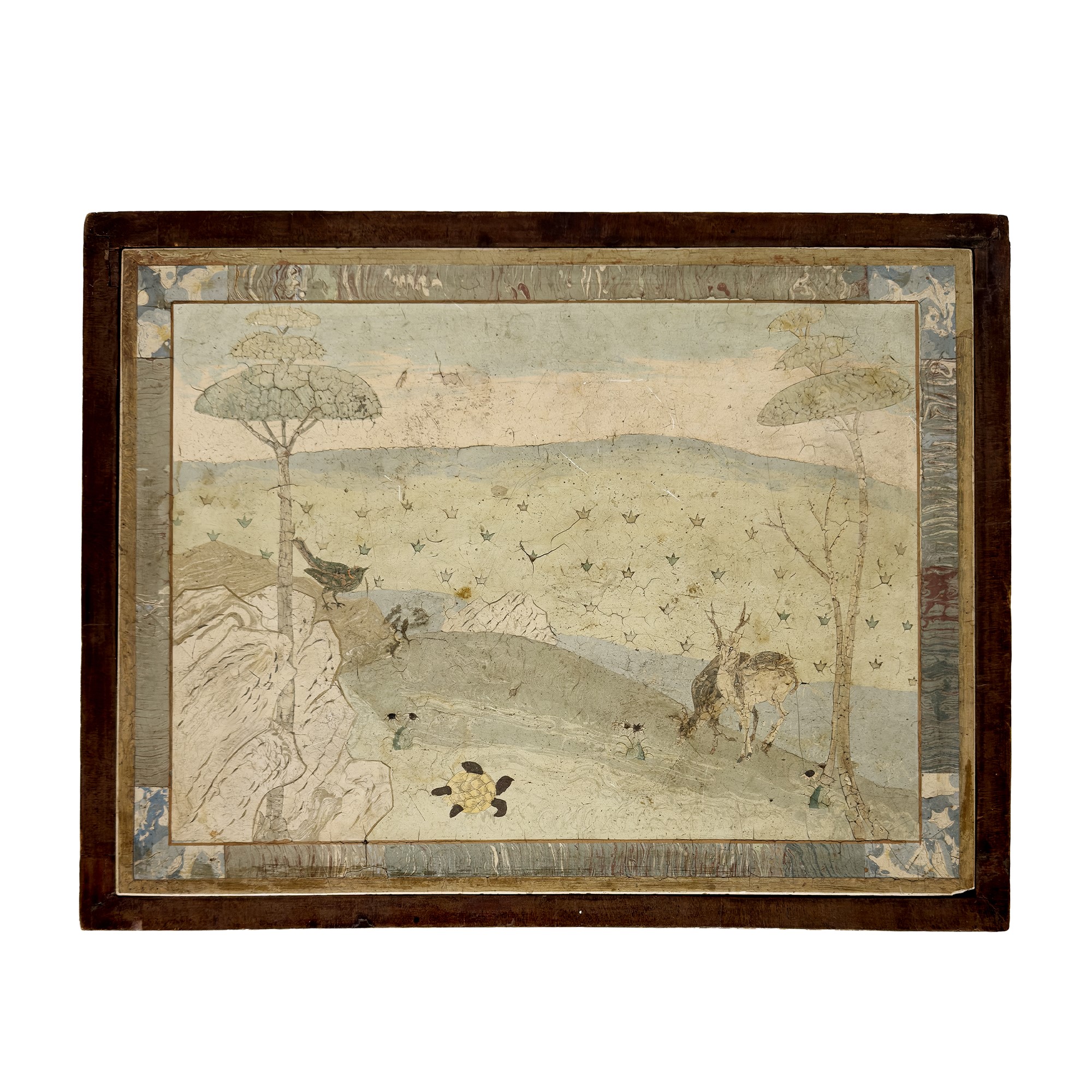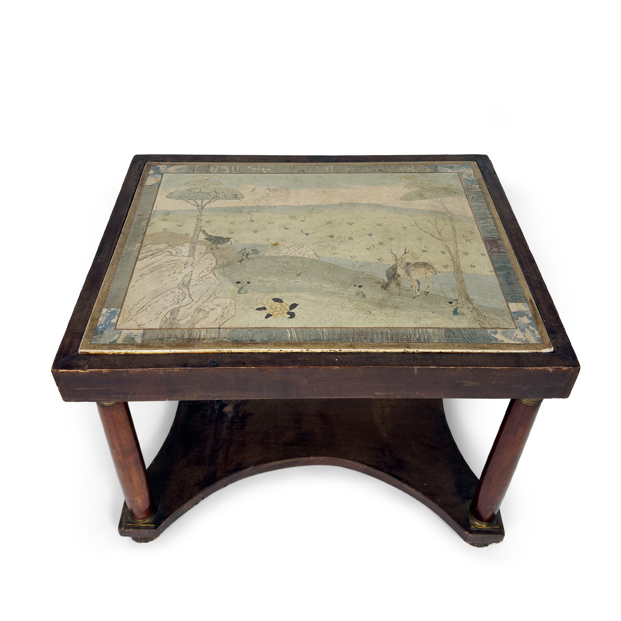 raffigurante un paesaggio con cervi, volatili e pini marittimi; con montanti a colonna su pedana quadrilobata, cm. 57x76,5x57,5