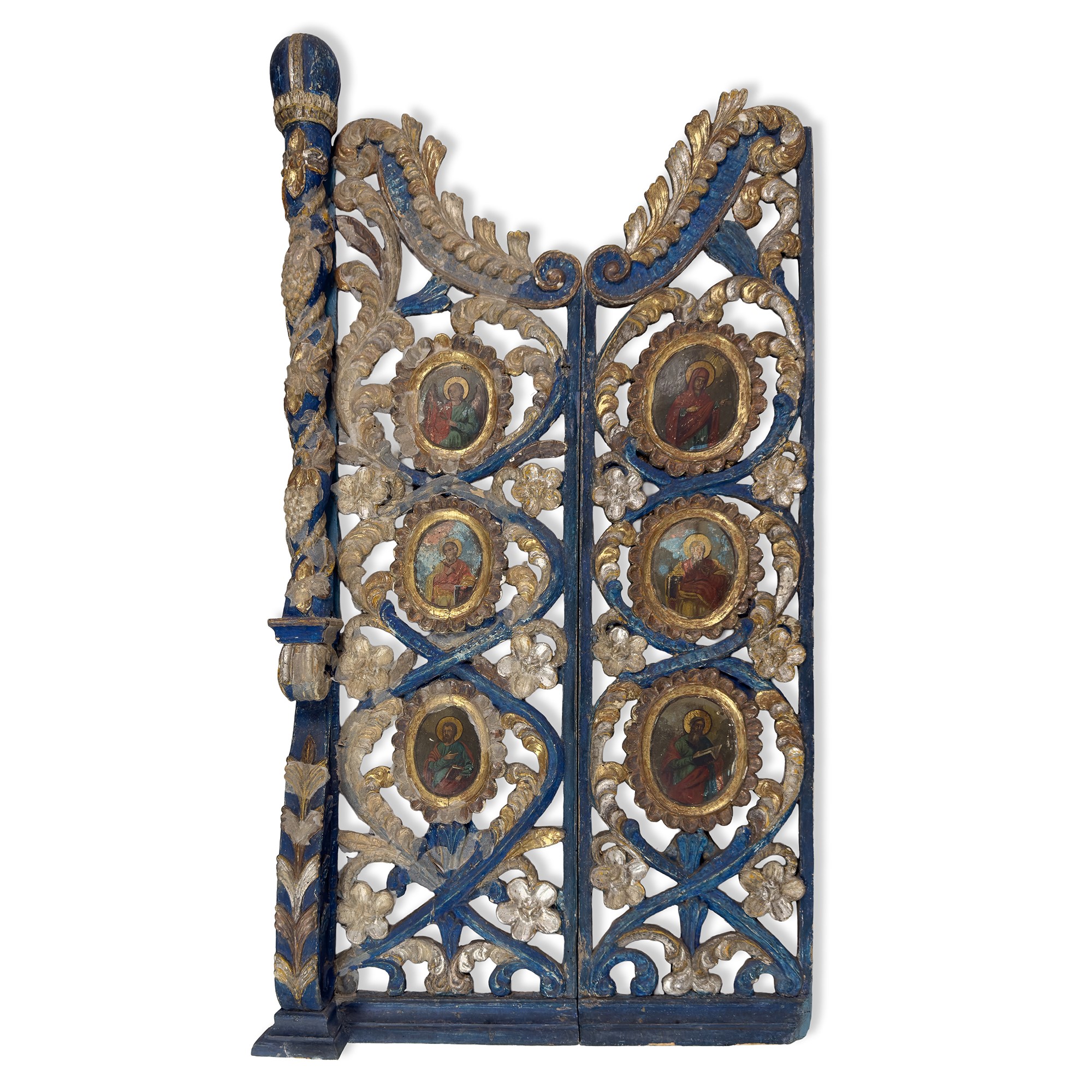 Portina da altare in legno dorato, argentato e dipinto azzurro, Europa dell'Est, XIX secolo