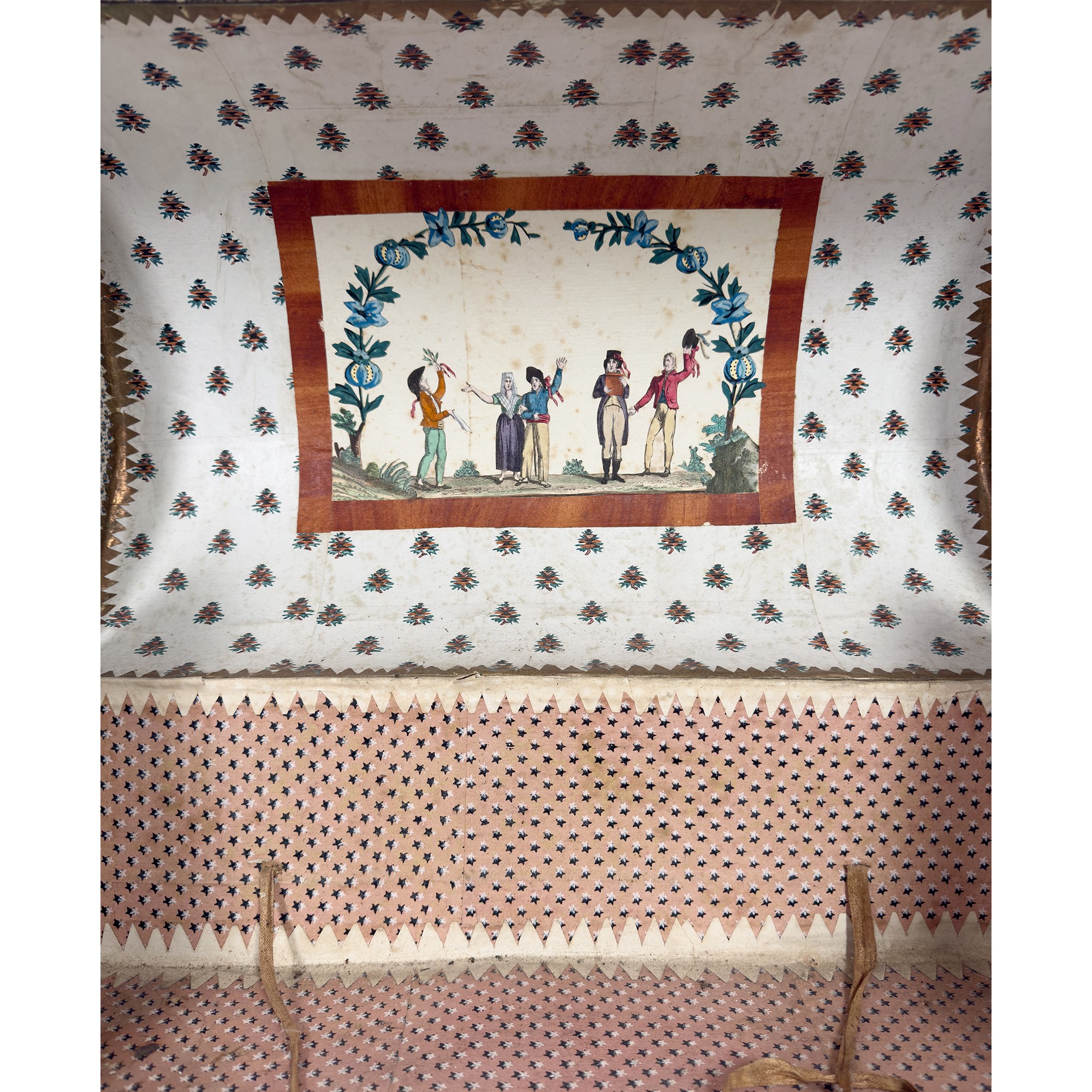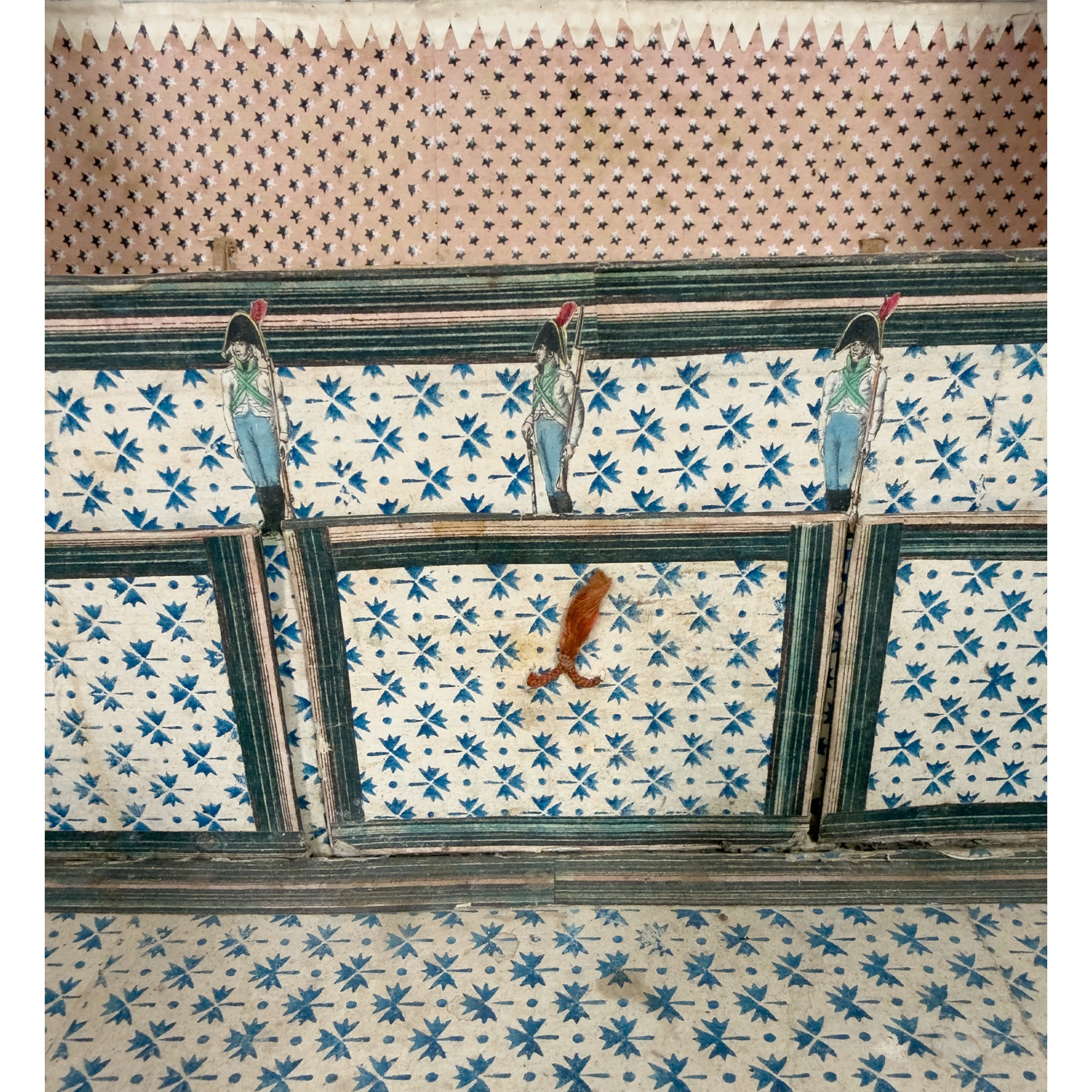 rivestito di incisioni acquarellate, papier-peints e grisailles a temi militari e scene di genere; fronte apribile a ribalta celante tre cassetti allineati, cm. 37x57x32,5 (qualche difetto)