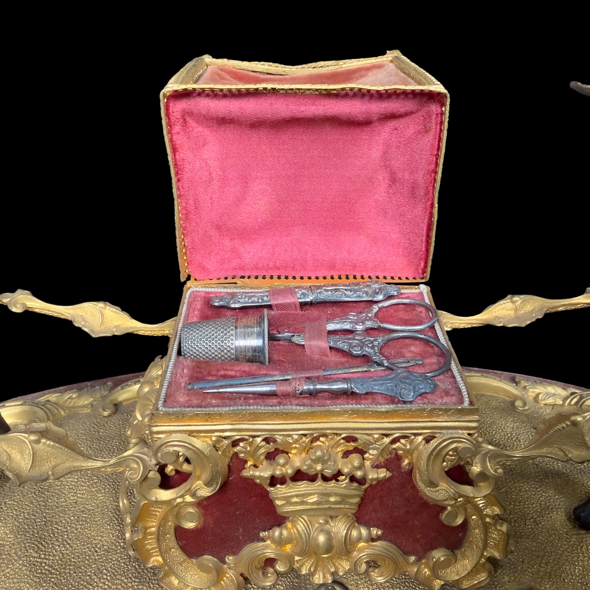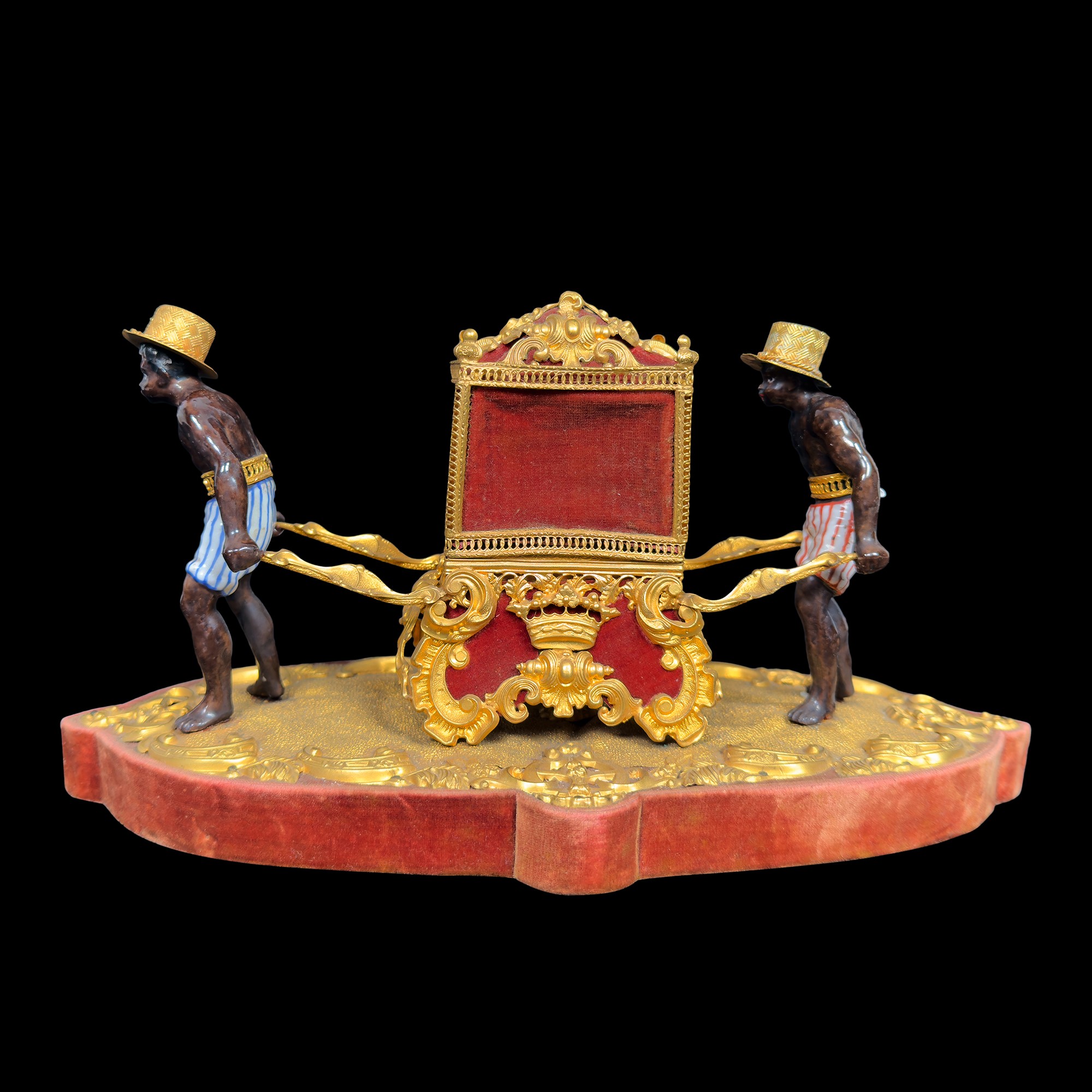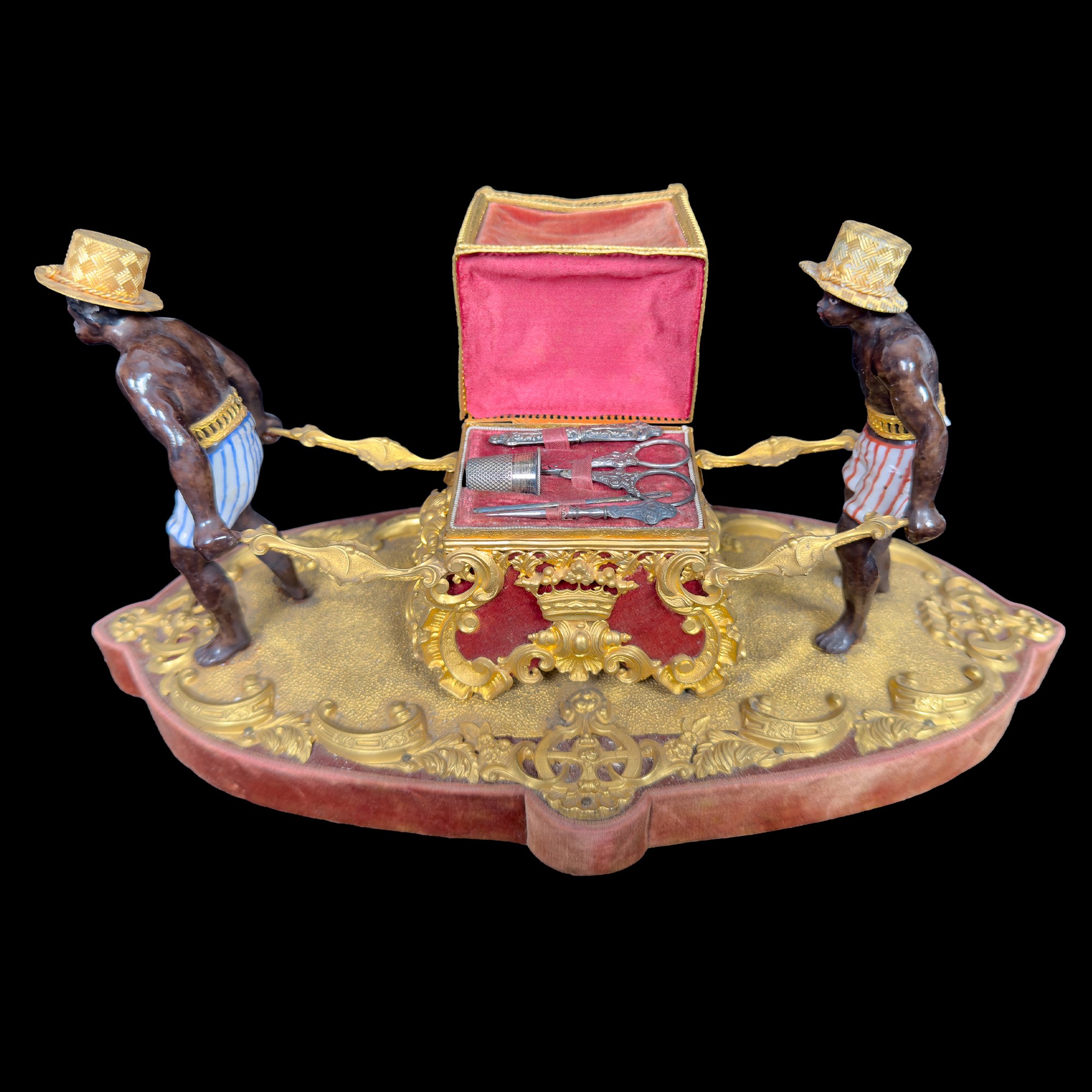 caratterizzato da due portatori mori in porcellana policroma che sostengono una sorta di portantina al cui interno sono custoditi gli strumenti all'uopo in argento e metallo; ricca montatura in matallo dorato, sbalzato e cesellato a motivi di gusto classico, cm. 15x29x13,5 (qualche difetto)