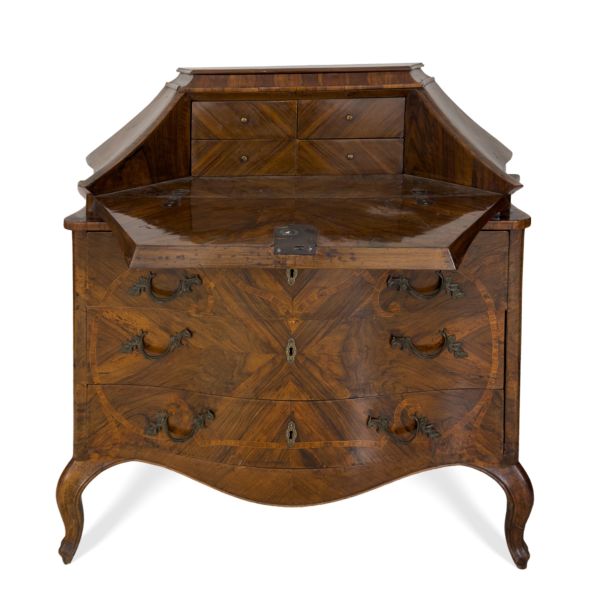 intarsiata in bois de rose a riserve mistilinee. Fronte e fianchi di linea mossa; sul prospetto ribalta celante quattro cassetti, sovrastata da un tiretto segreto; tre cassetti sottostanti completano il mobile; gambe a voluta, cm. 112x124,5x48 (qualche restauro)
