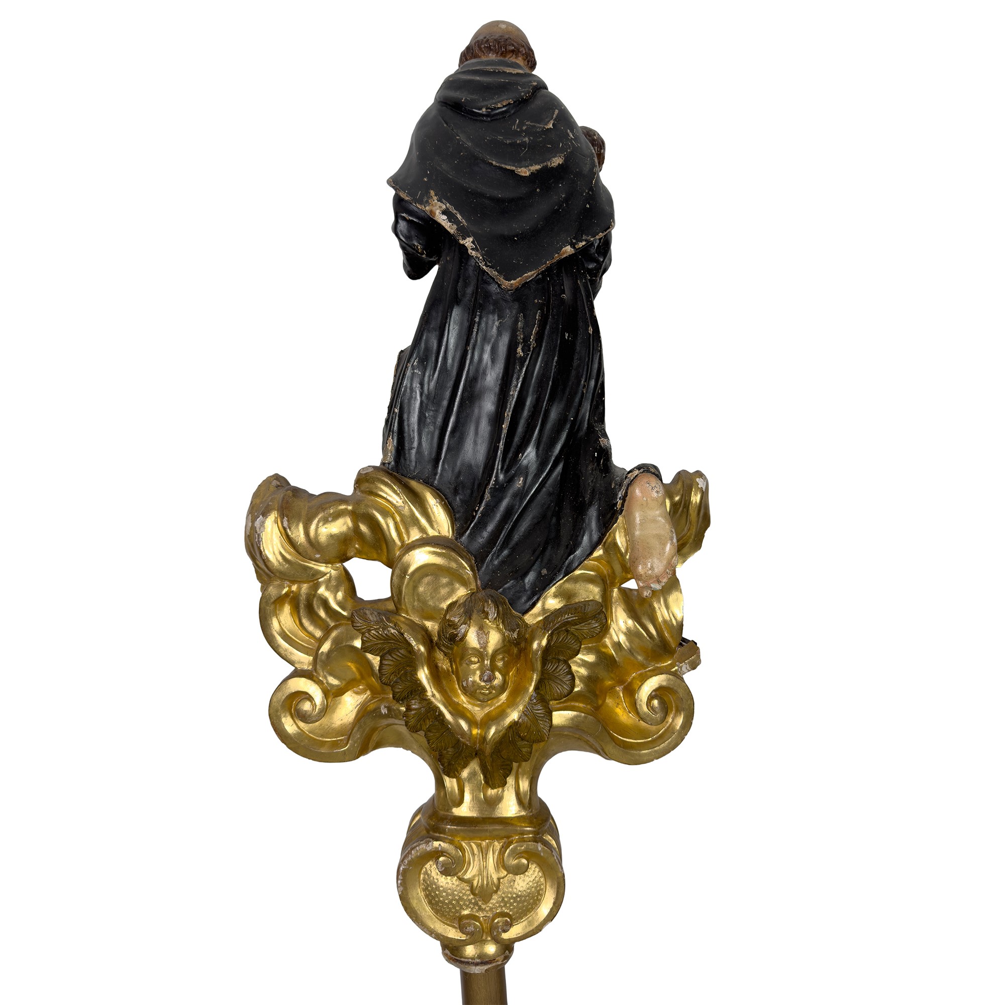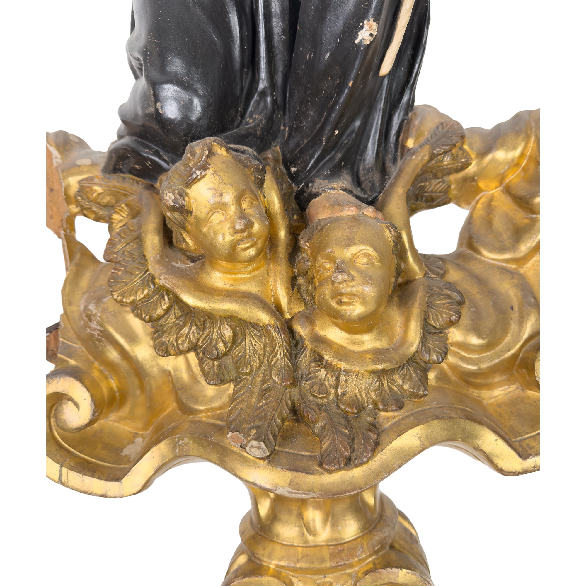 il gruppo emerge da un fregio in legno dorato caratterizzato dalla figura di due cherubini; montato su struttura non coeva, il gruppo: cm. 104x55 circa (mancanze)