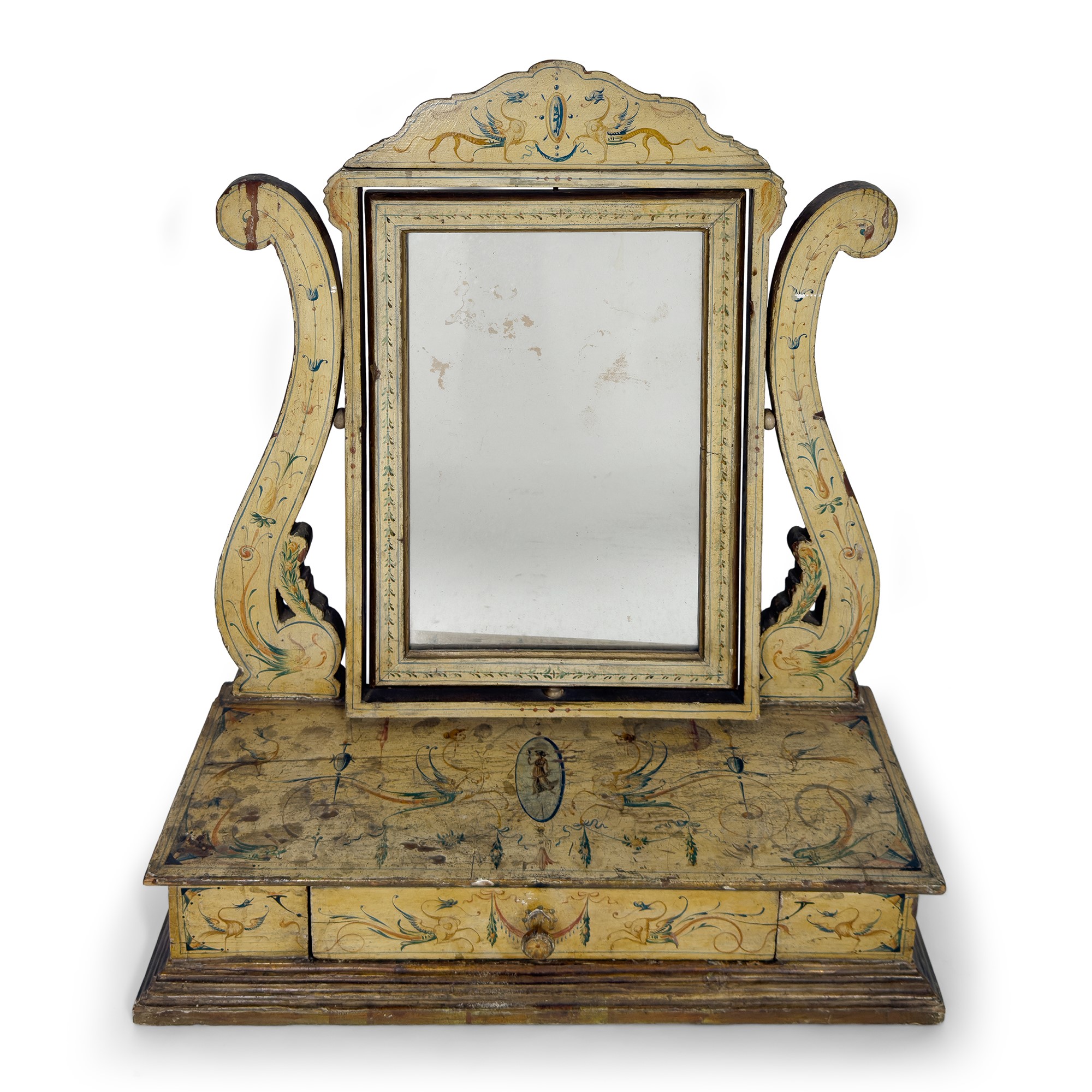 dipinta in policromia a motivi neoclassici; specchio a bilico sostenuto da montanti a voluta; base munita di un tiretto, cm. 69x60x21