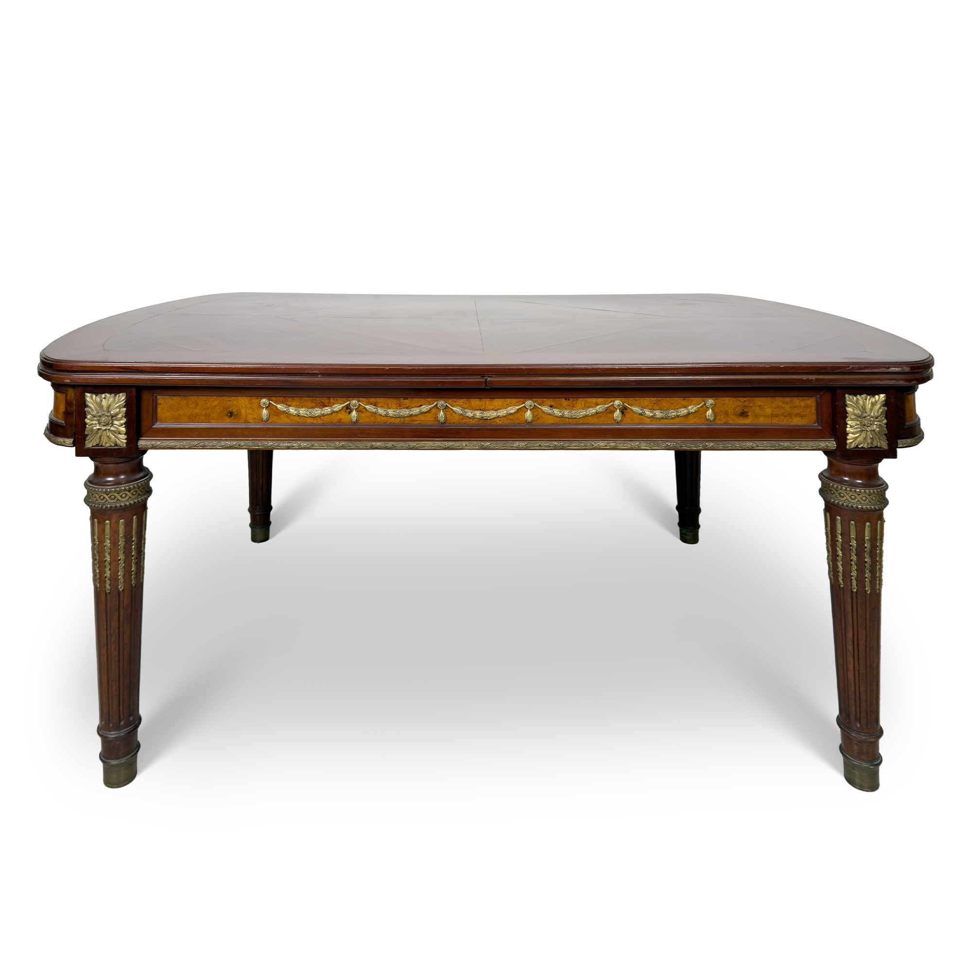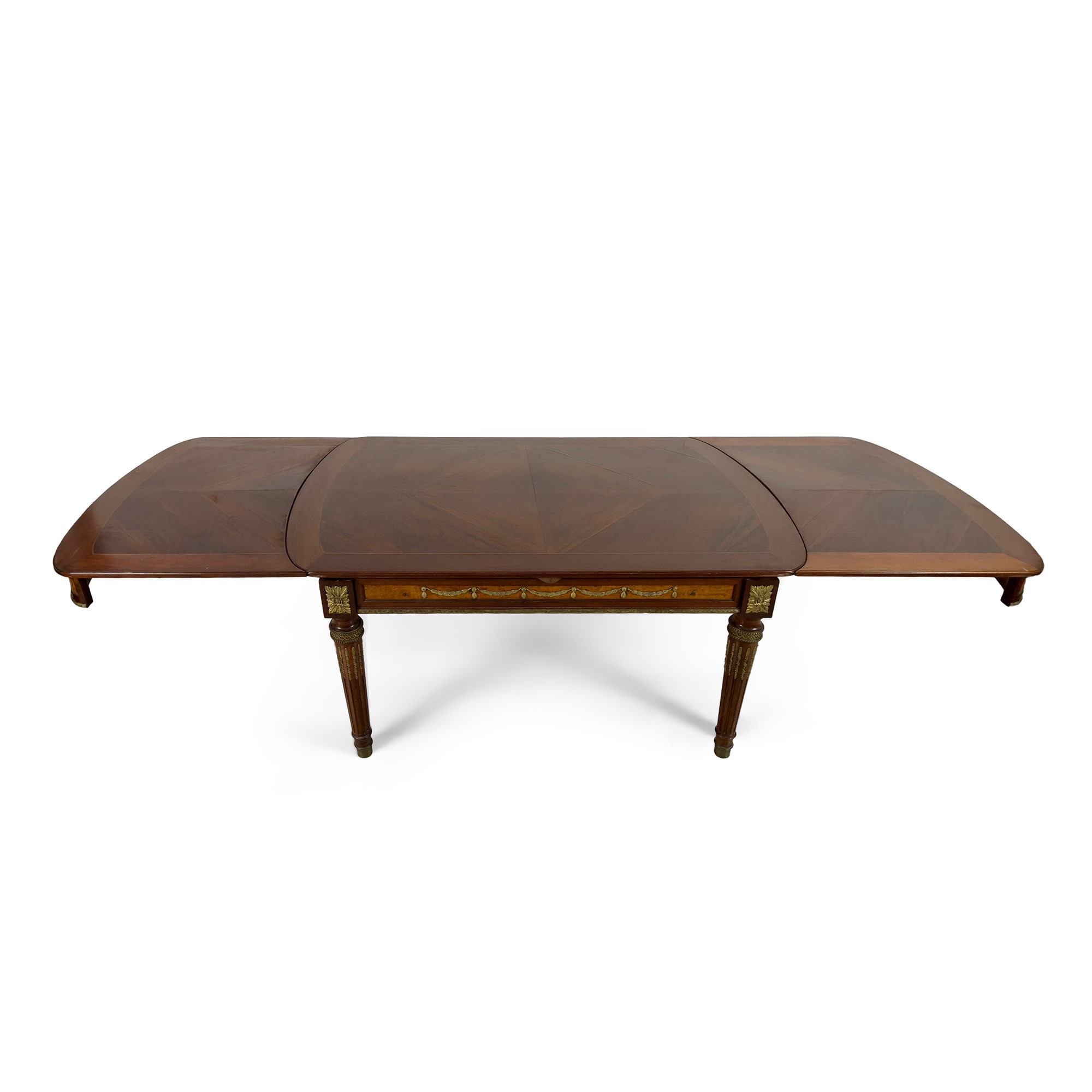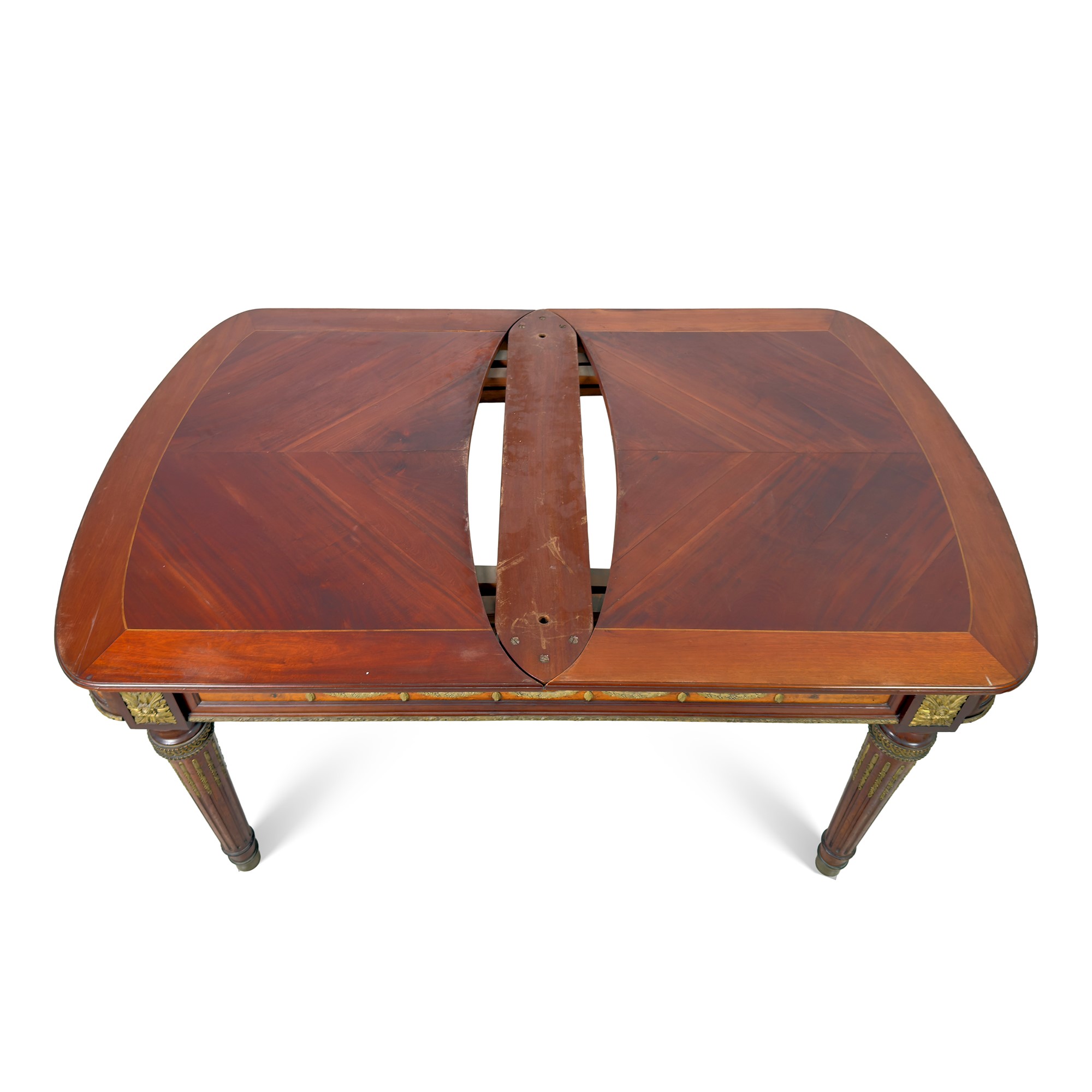 piano allungabile mediante due prolunghe laterali contenute all'interno; applicazioni di fregi di gusto neoclassico in metallo dorato, cm. 77x170x110; completamente allungato: cm. 77x315x110.