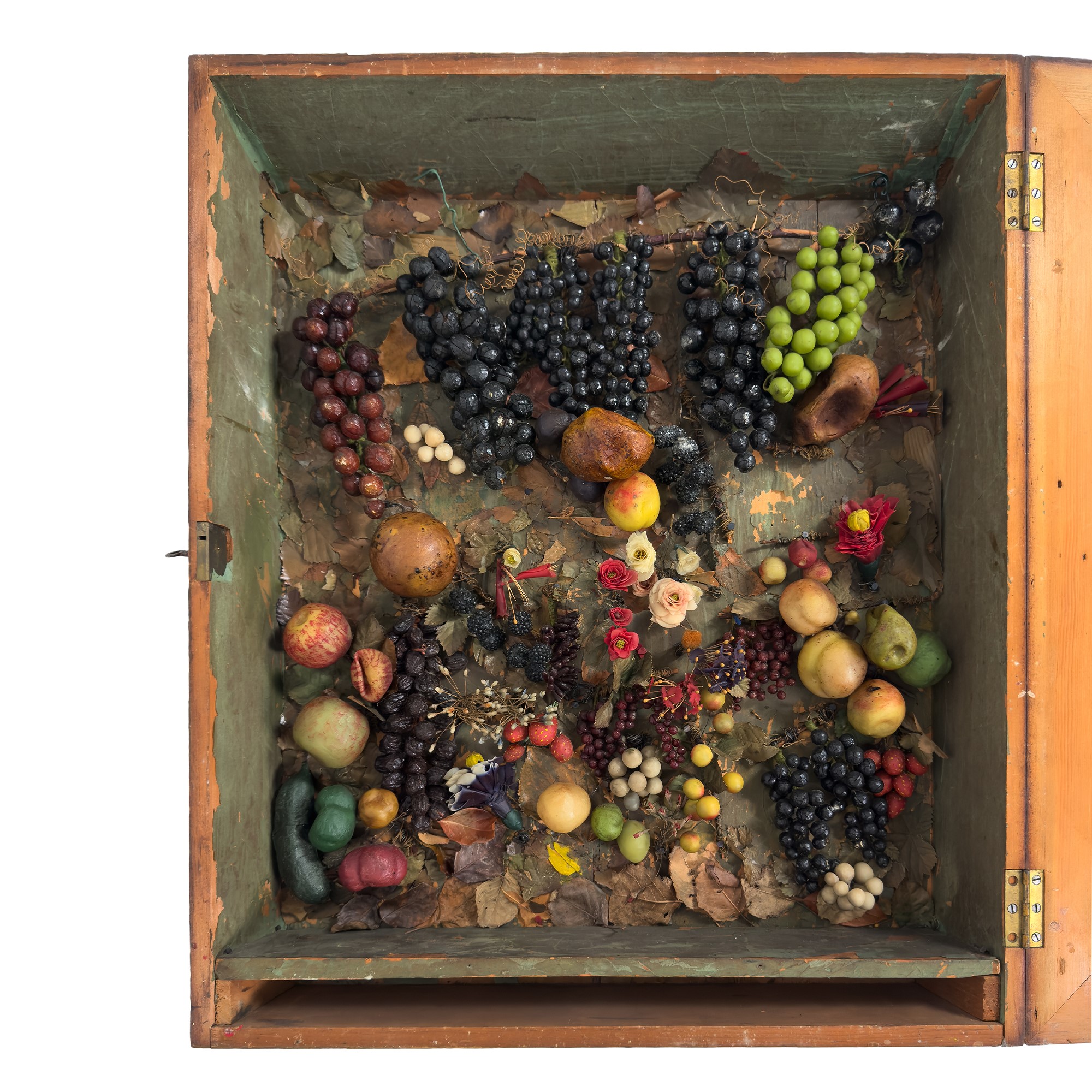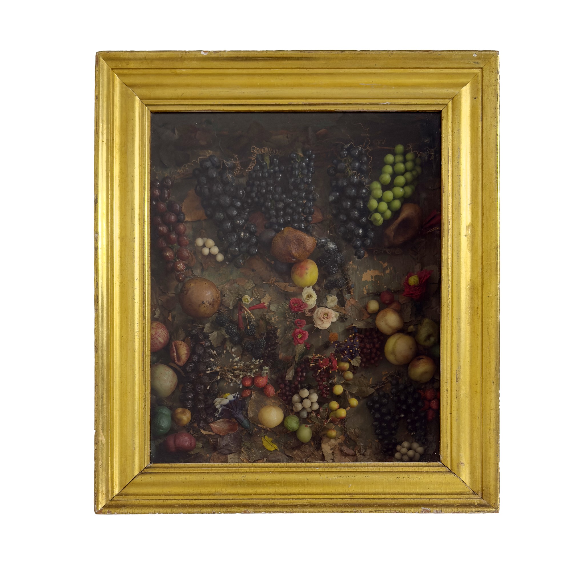 Teca in legno dorato contenente frutti autunnali in cera policroma