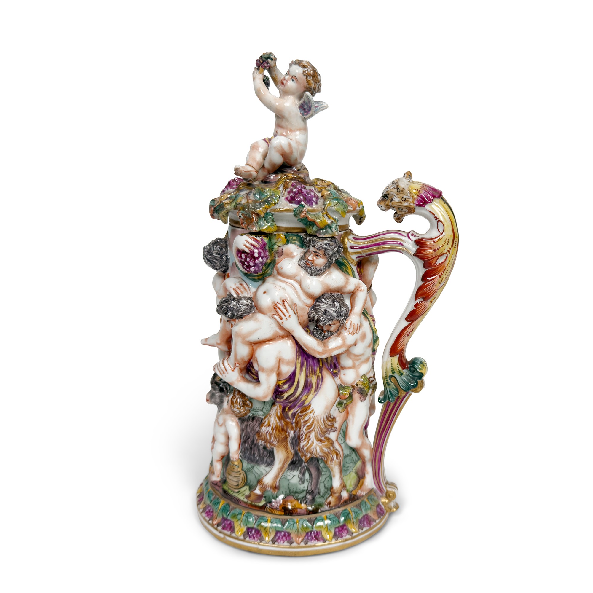modellato a raffigurare il corteo di Bacco fra satiri e figure femminili rese in forte rilievo; presa a voluta culminante in una testa di felino; presa del coperchio in forma di putto bacchico, marca N coronata in blu sottosmalto, h. cm. 37 (qualche rincollatura e difetto)