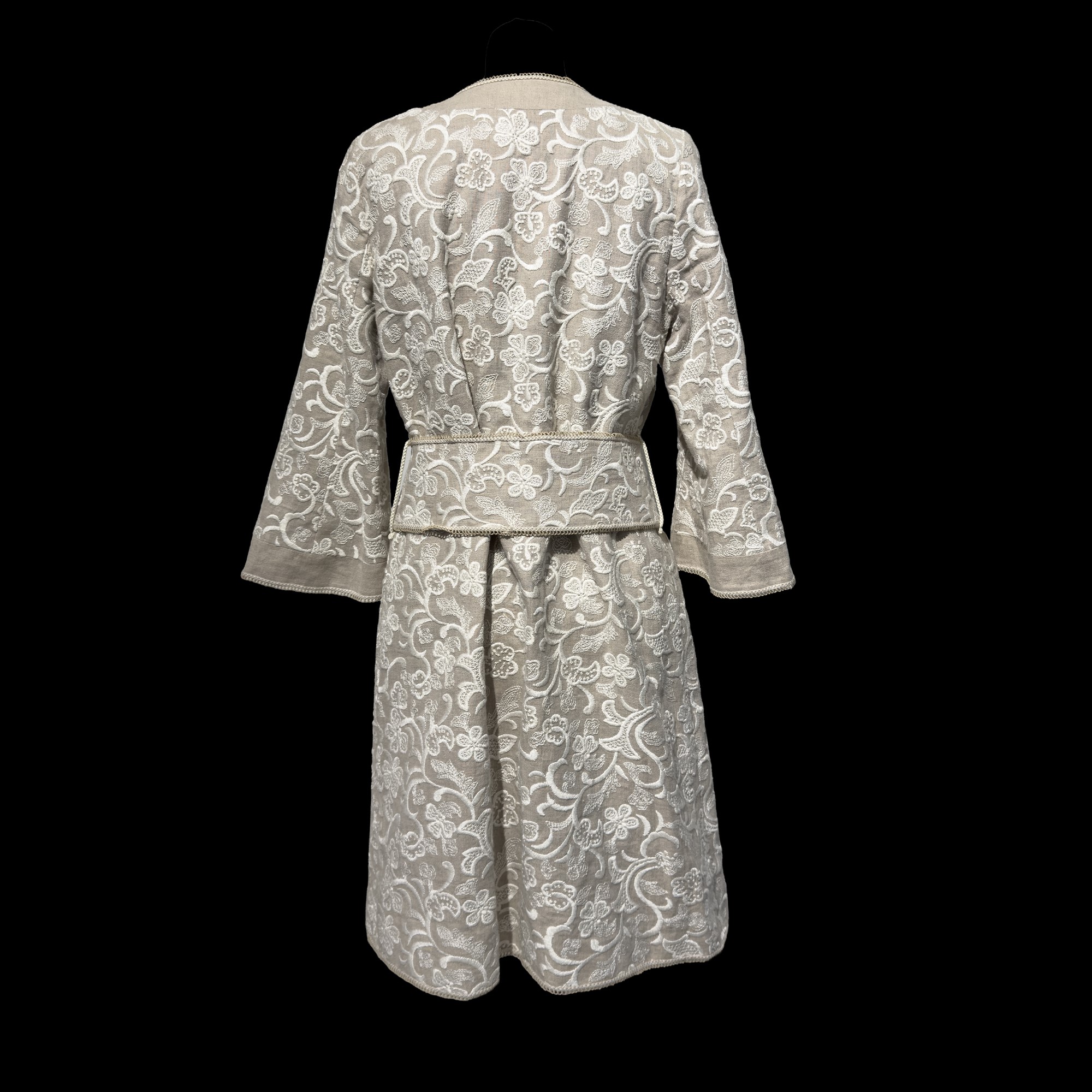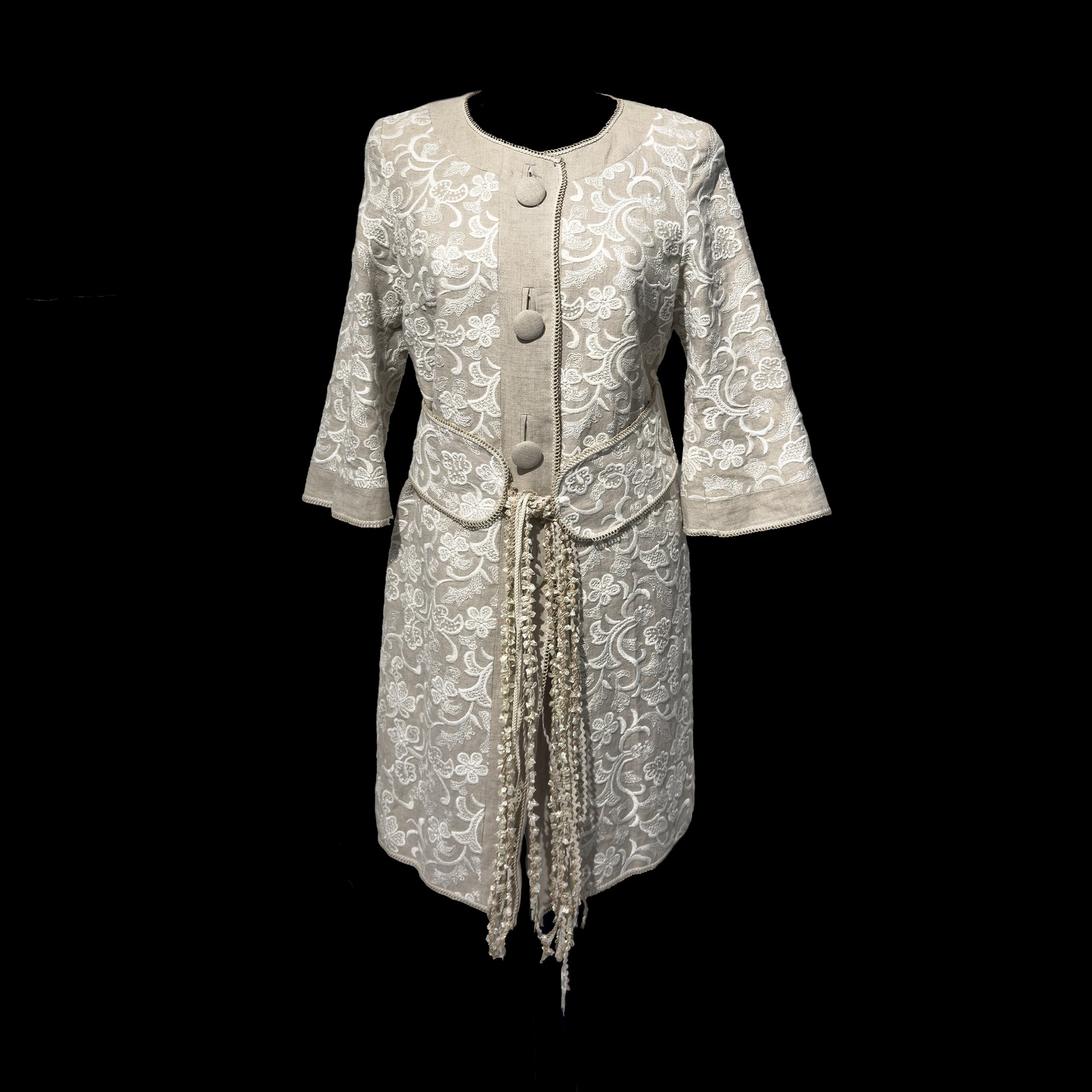 cappottino in lino a fondo beige con ricami e motivi floreali color avorio, tg.44.