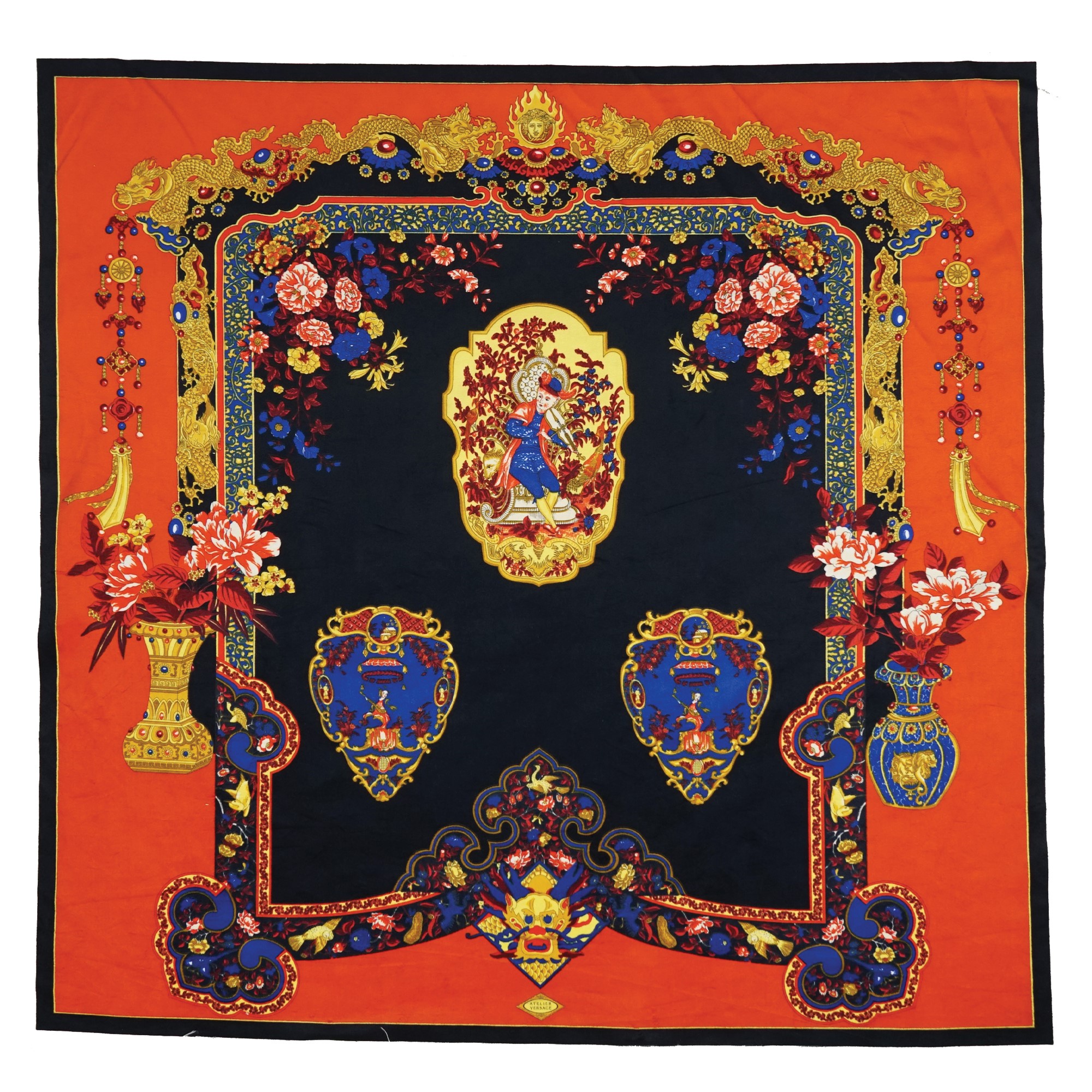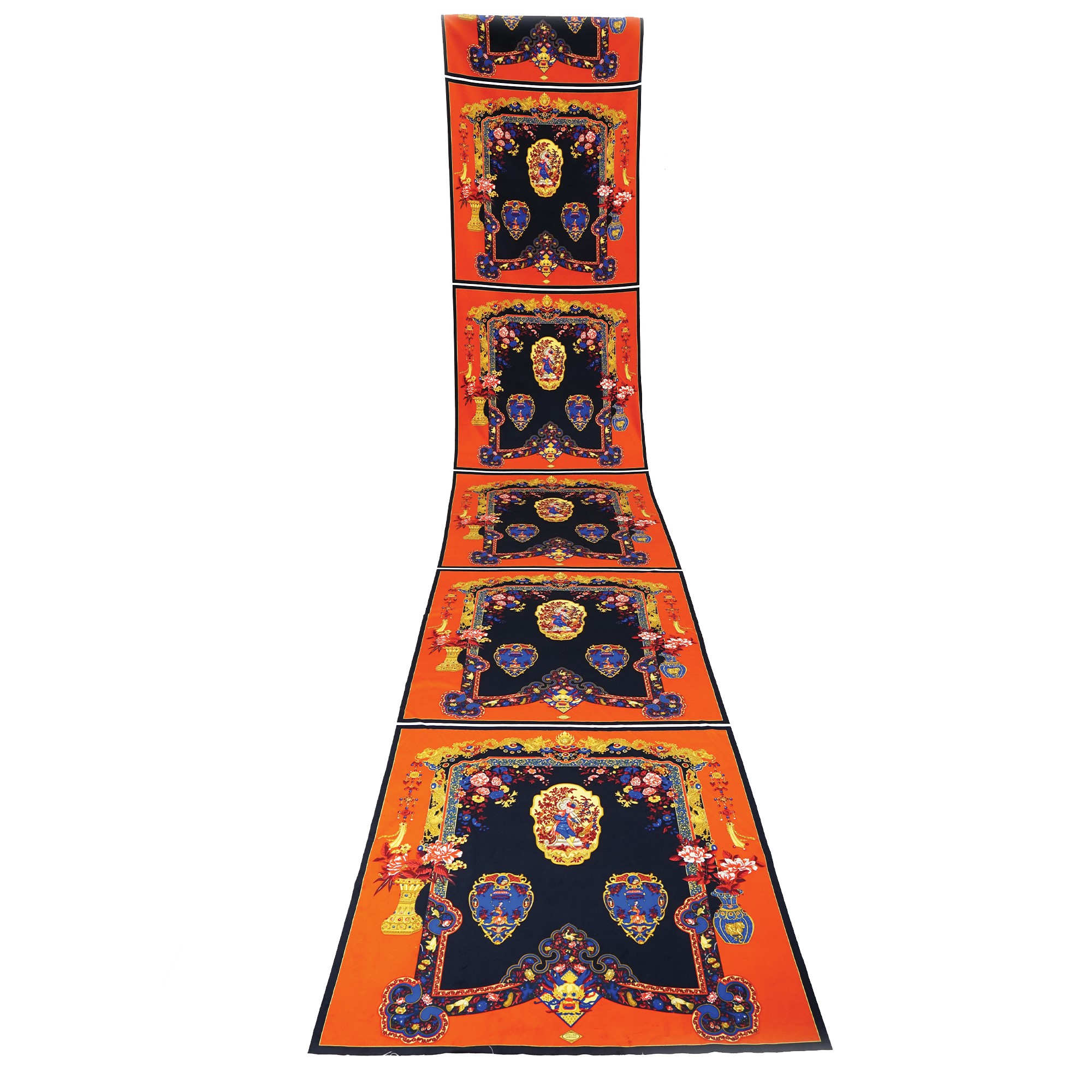 tessuto di velluto costituito da otto pannelli policromi decorati a cineserie su fondo nero nei toni dell' arancio, blu e oro, complessivamente cm. 700x150 (tessuto fuori produzione).
