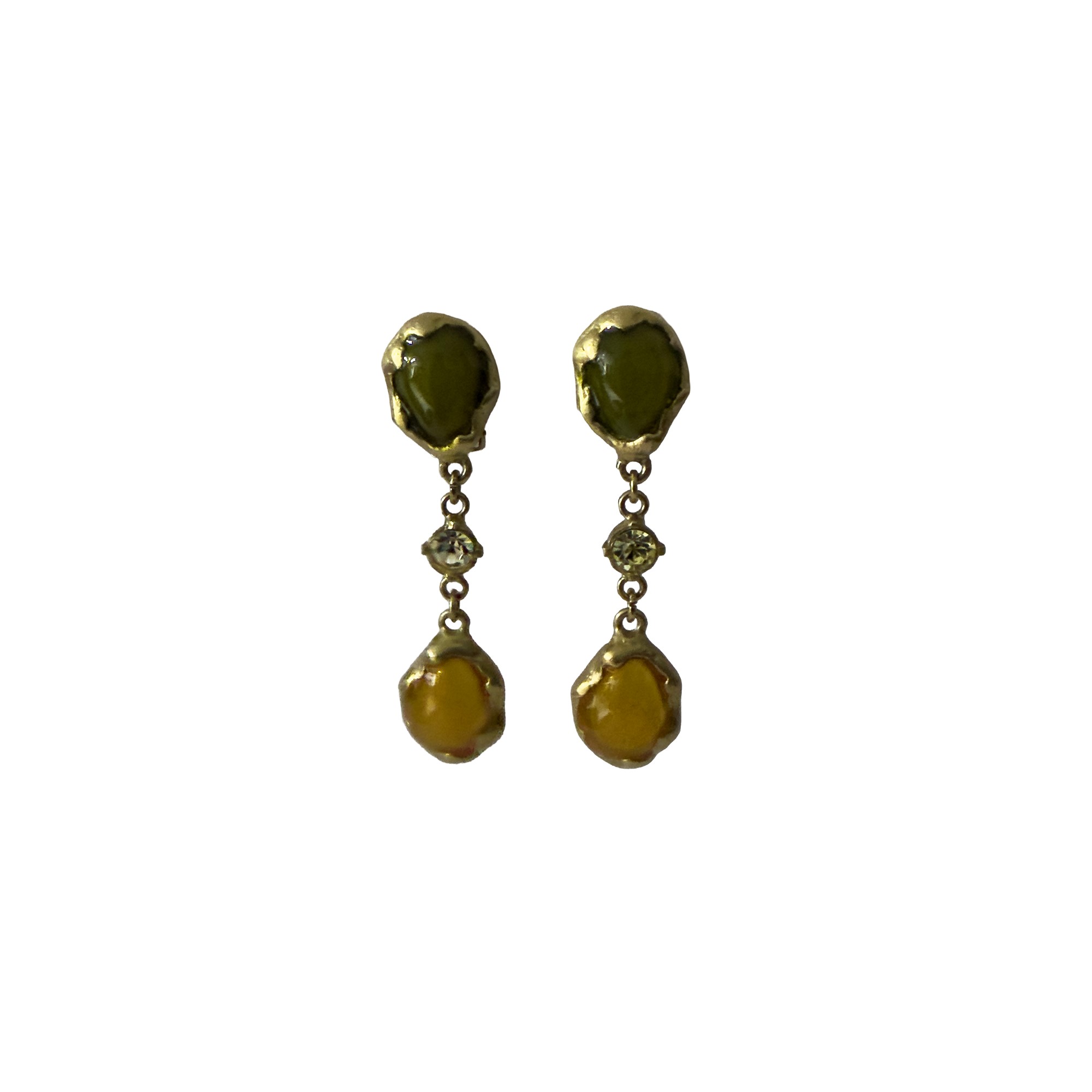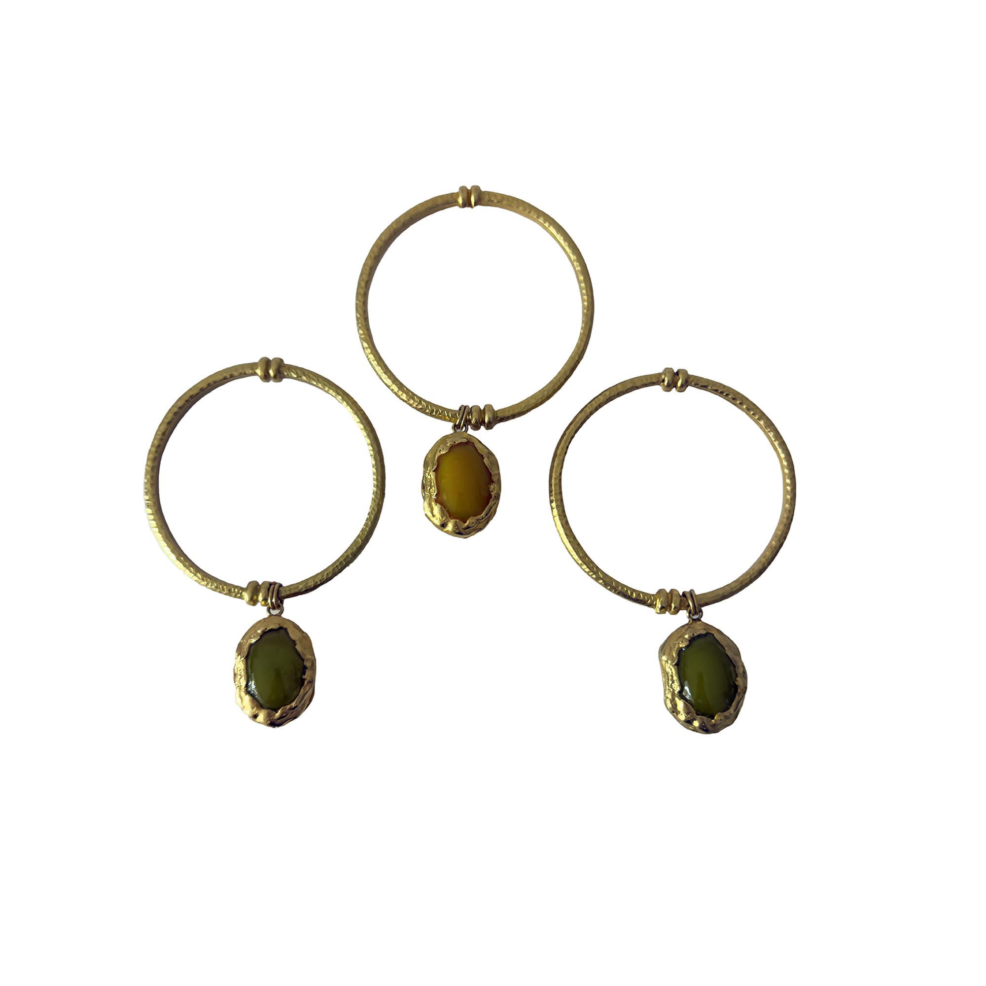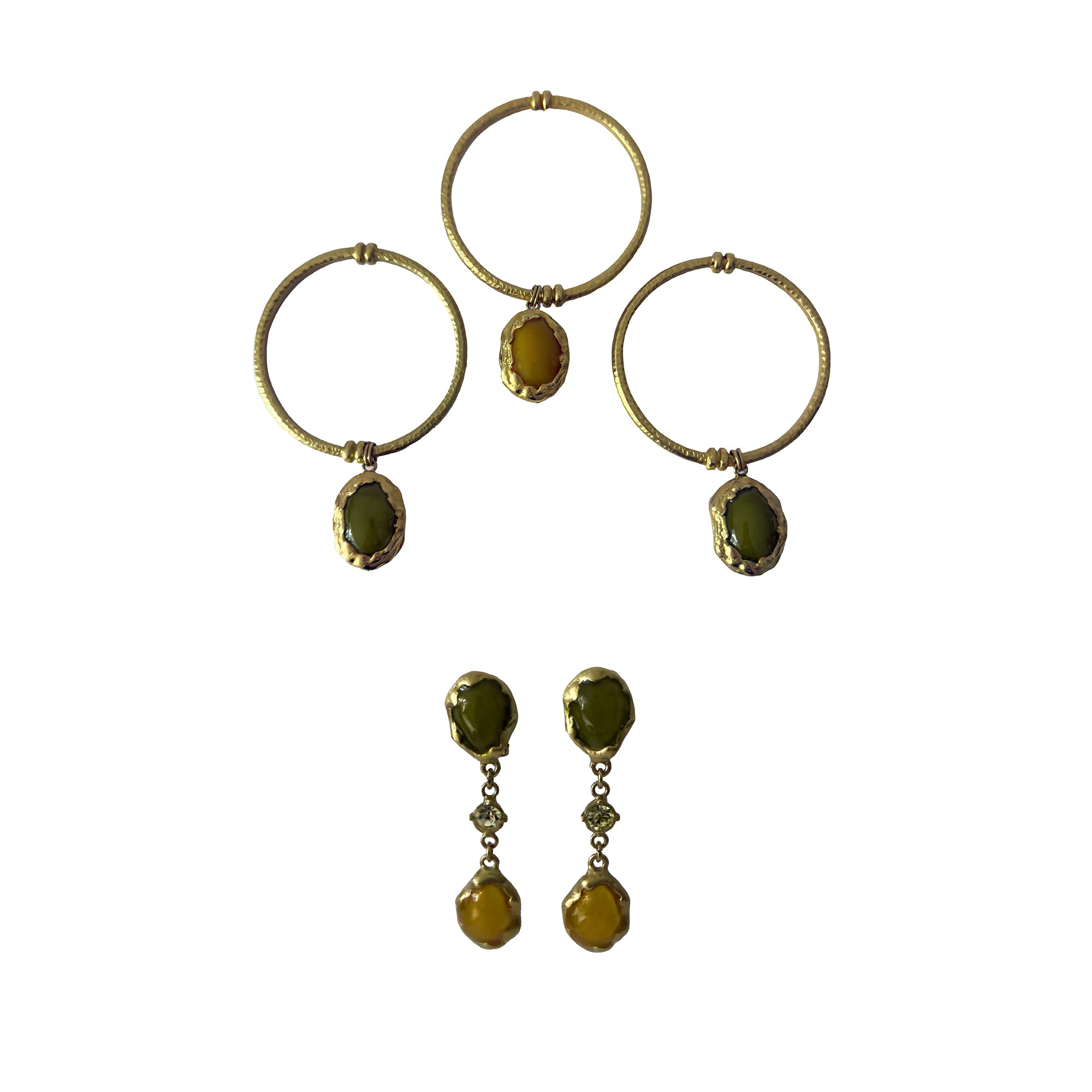 tre bracciali rigidi in metallo dorato con pendente a medaglione con pietre cabochon verde e giallo UNITI a un paio di orecchini con il medesimo decoro, i bracciali: d. cm. 7; gli orecchini: l. cm. 7.