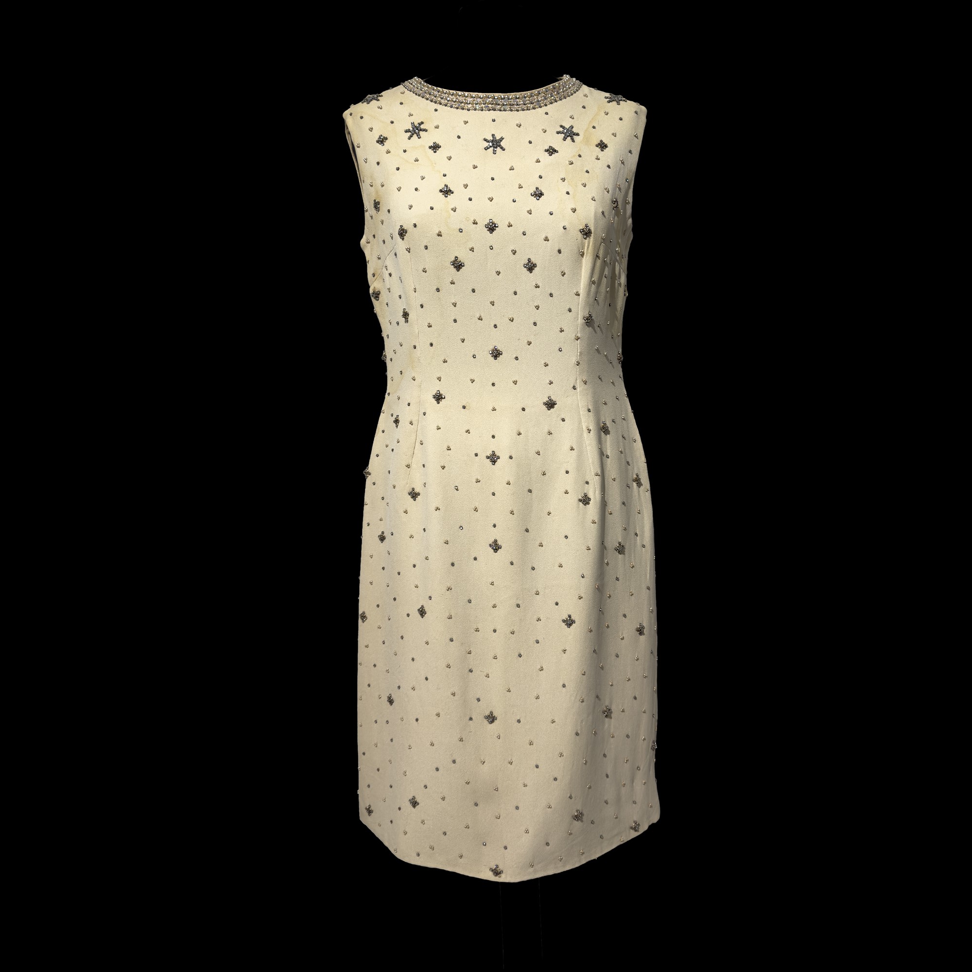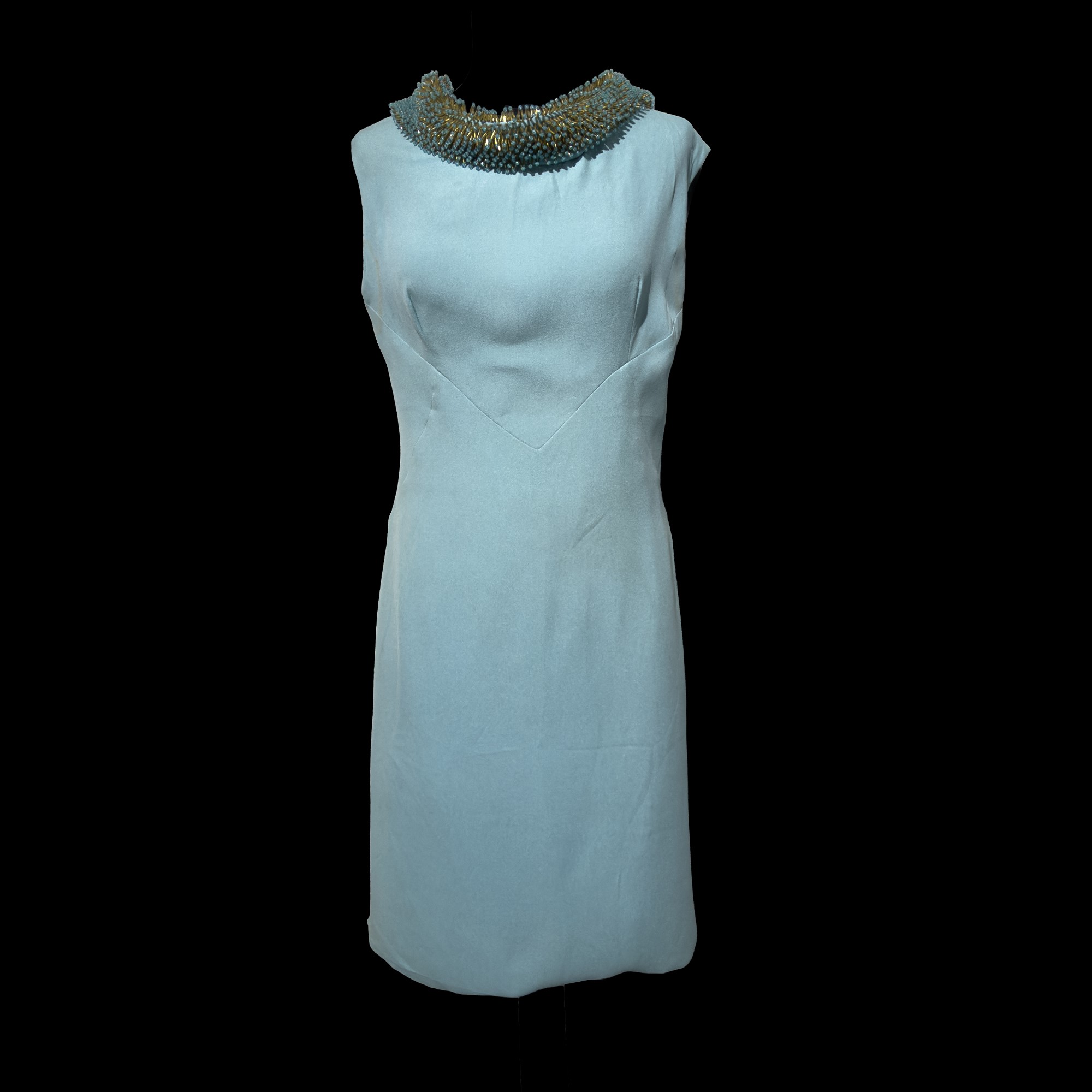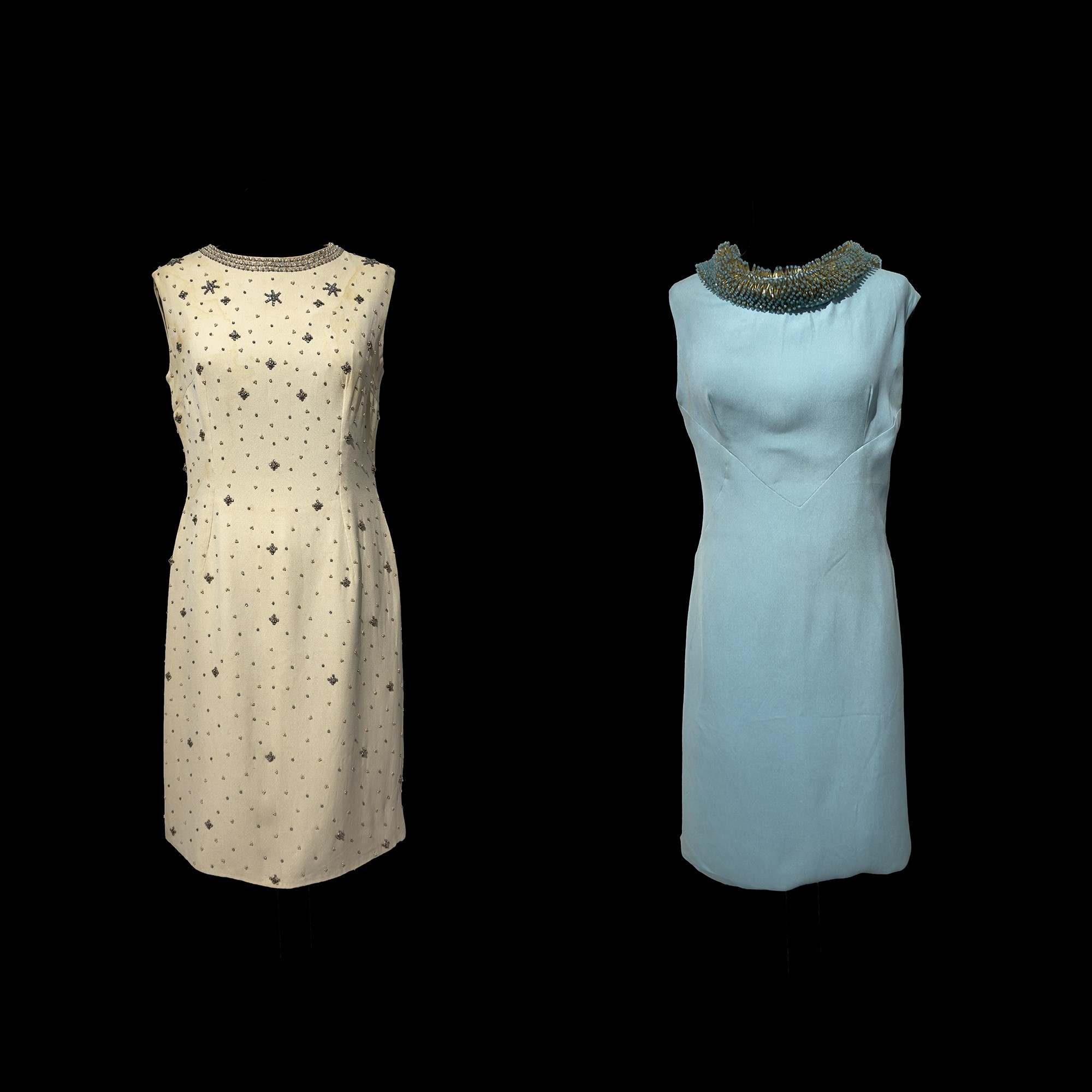 uno in tessuto verde acqua con collo ricamato e l'altro in tessuto color panna interamente ricamato con perline e strass, tg. 44 (indicativa) (macchie diffuse e difetti)