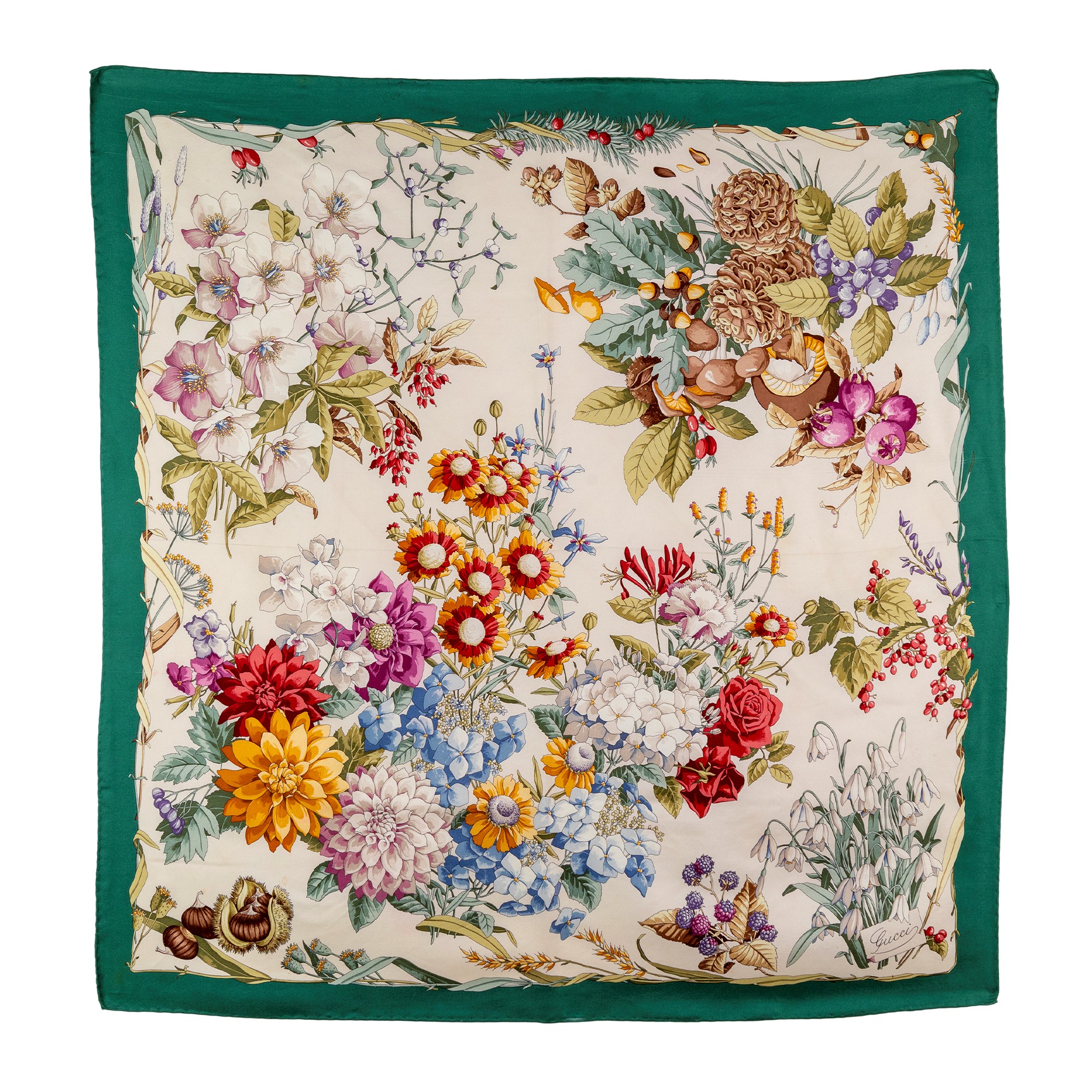 Flora, foulard in seta con bordo verde, cm. 90x90 circa.