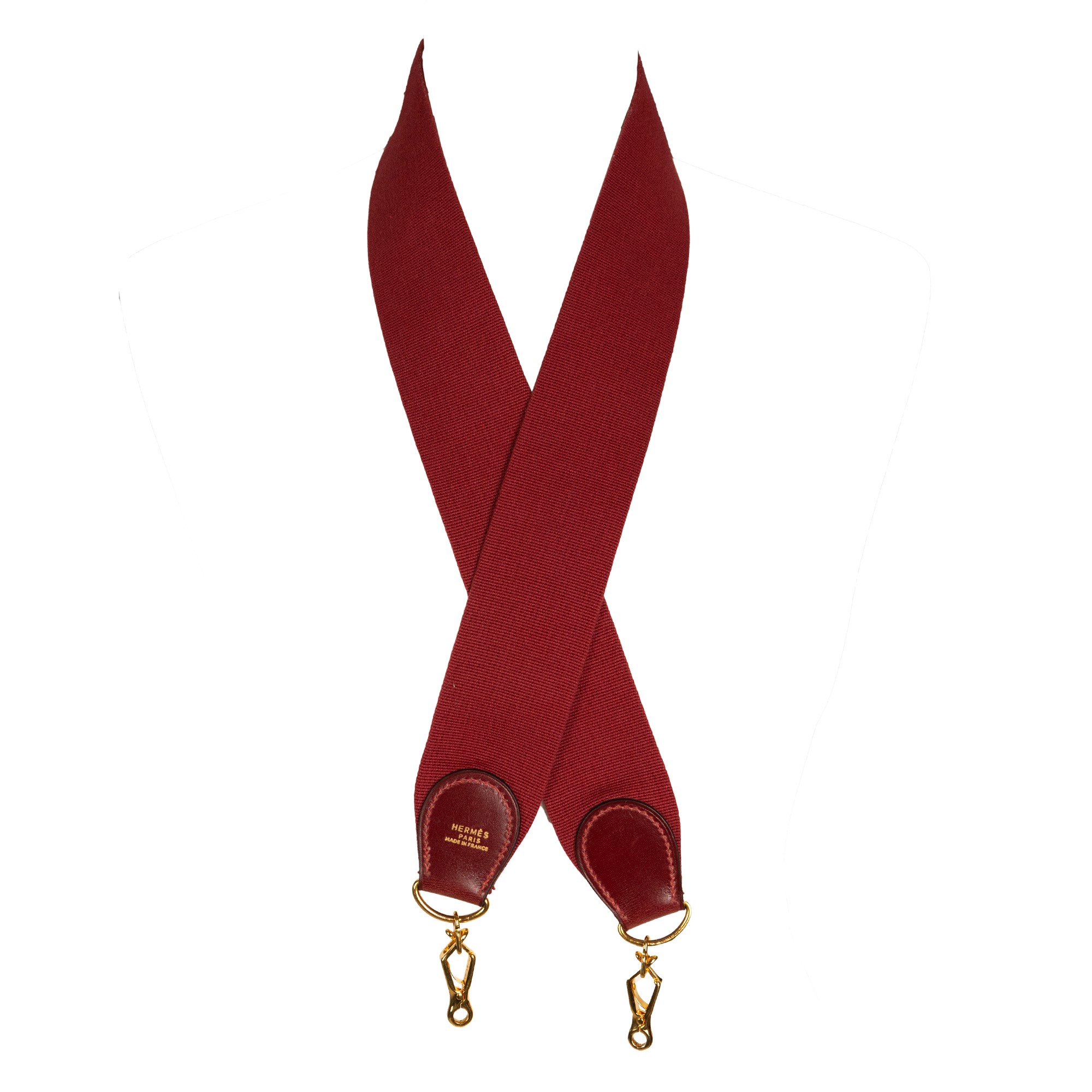 tracolla in tessuto rosso bordeaux con dettagli in pelle del medesimo colore e in metallo dorato, cm.98x5 (morsetti compresi).