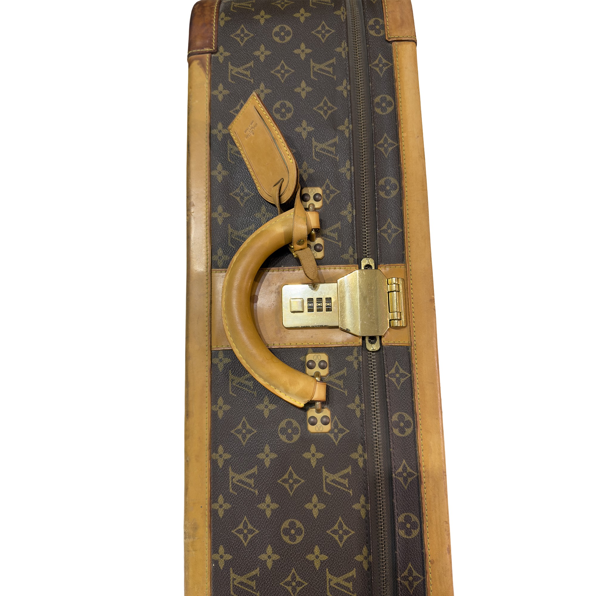 Stratos, valigia rigida rivestita in tela monogram con rinforzi in cuoio, cm. 22,5x20x45,5 (difetti).