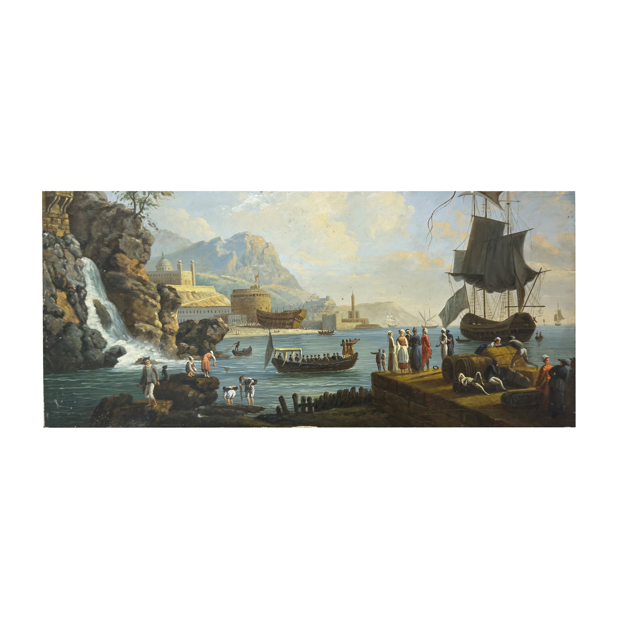Pannello rettangolare ad olio su tavola raffigurante una scena portuale