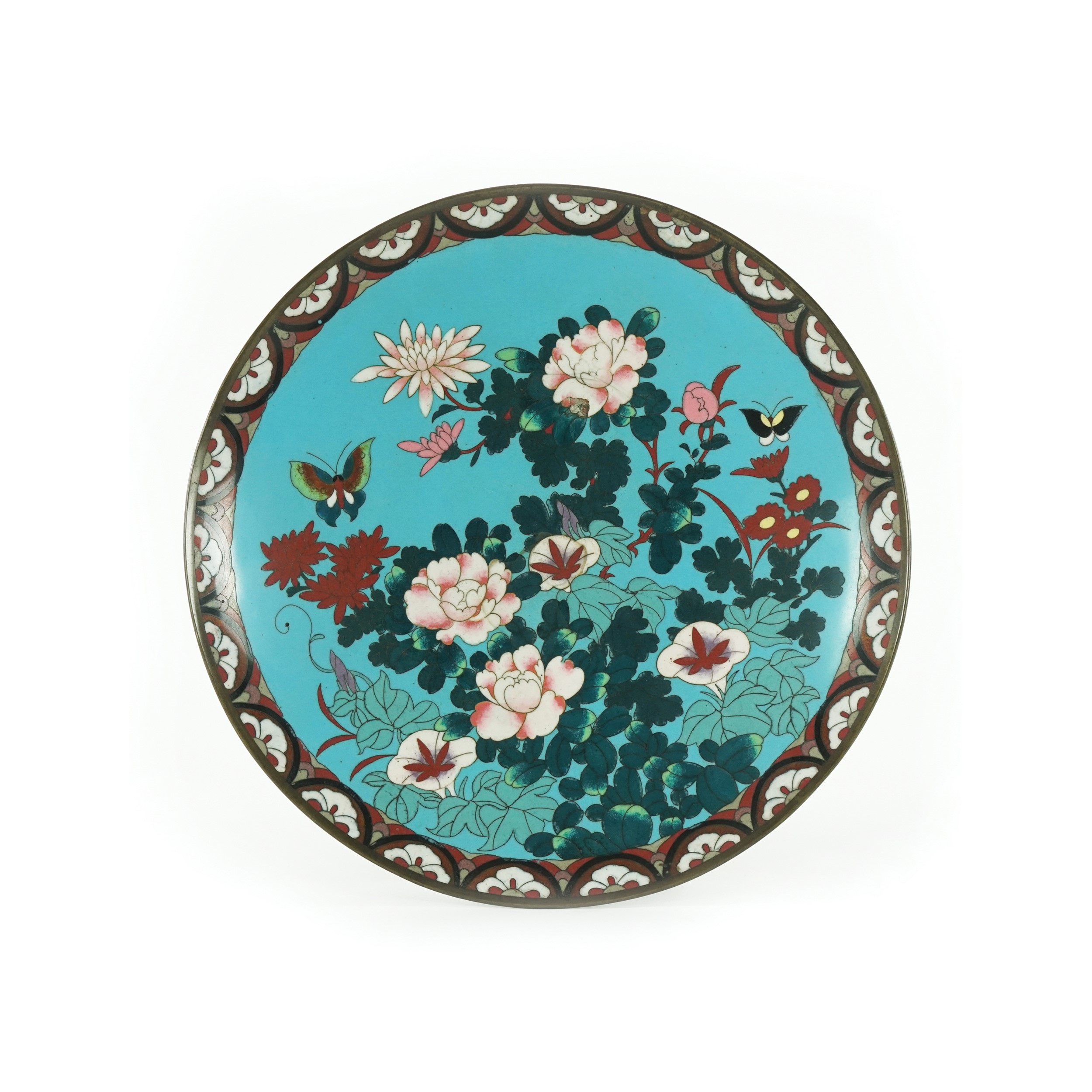 in smalti cloisonné policromi decorato a fiori e farfalle.