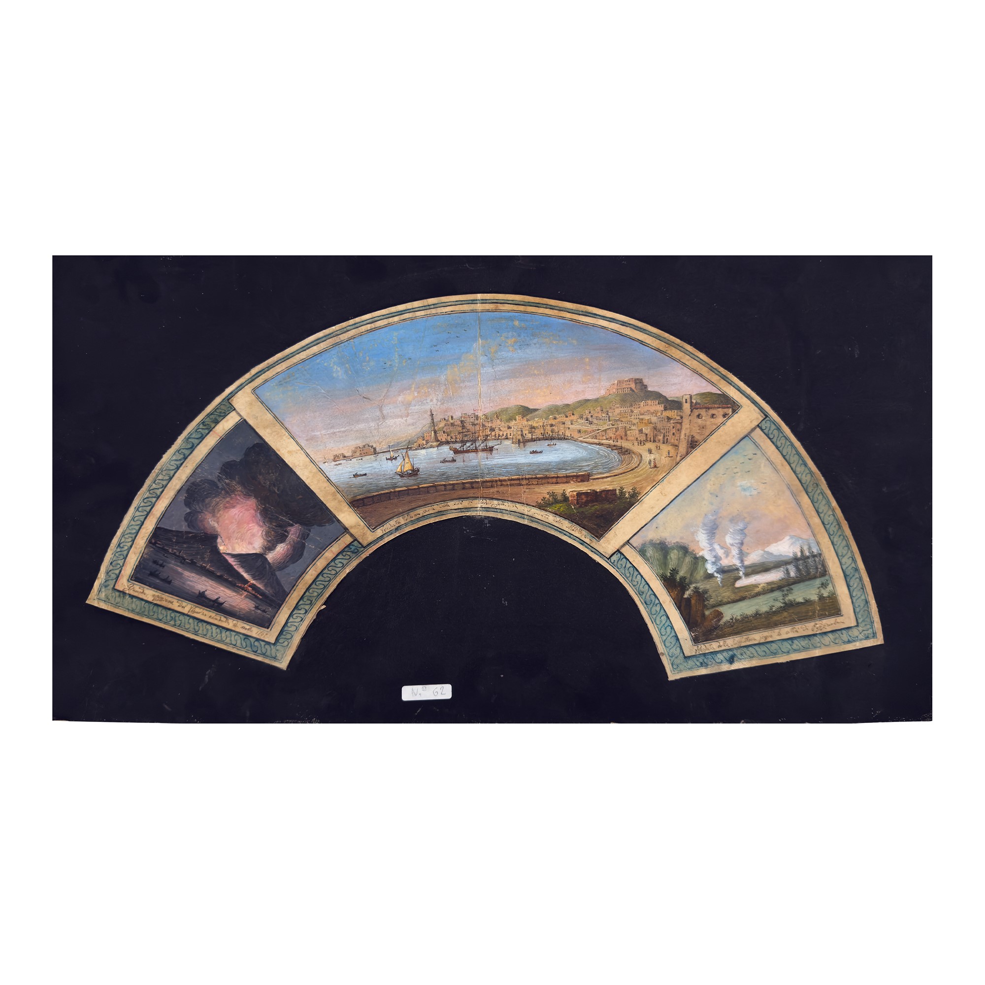 dipinta a raffigurare rispettivamente L'Eruzione notturna del Vesuvio del 1762, una Veduta di Napoli e una Veduta della Solfatara presso la città di Pozzuoli; applicata su un supporto rettangolare di cartone, l'ala: cm. 28x54