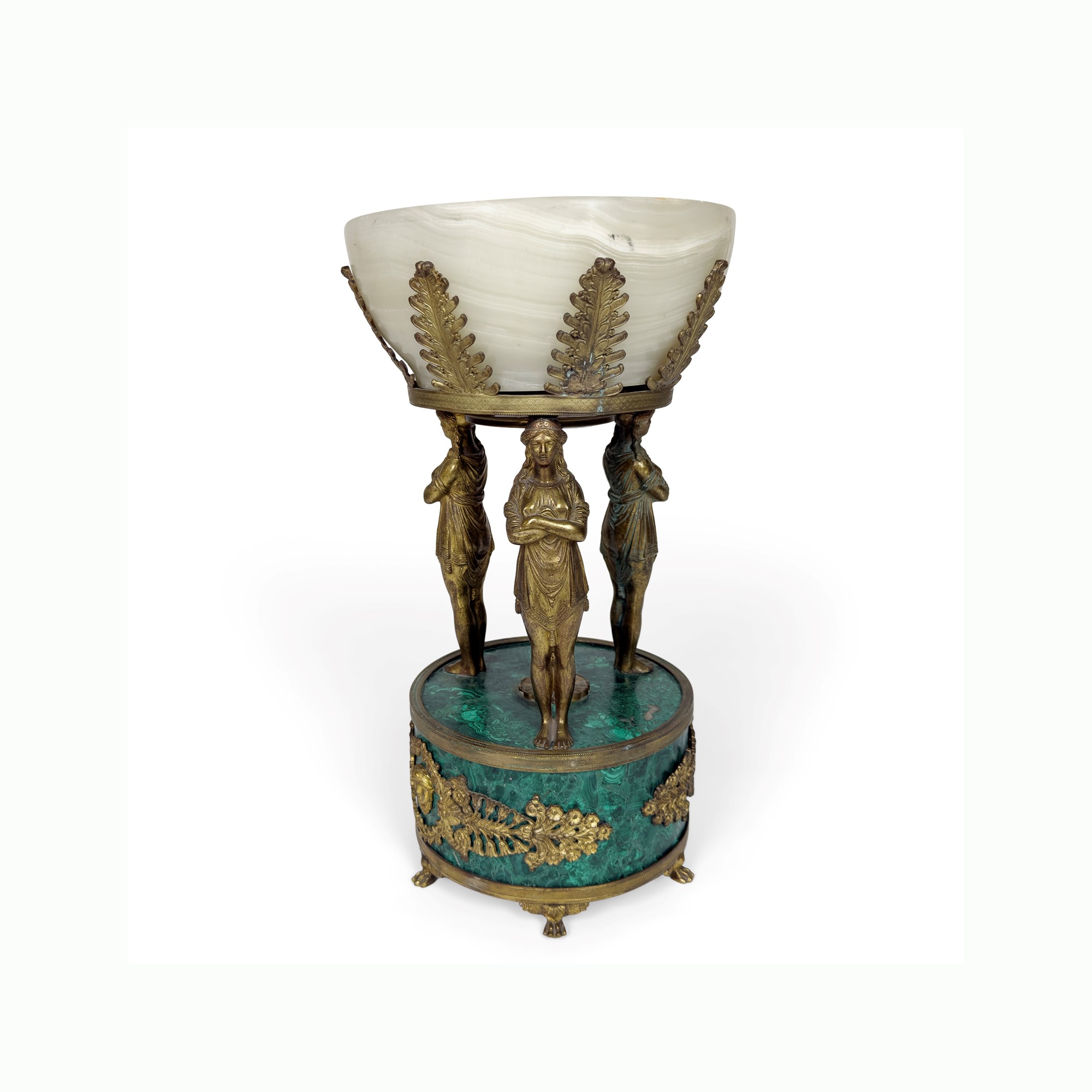 caratterizzata da tre figure femminili che sostengono il recipiente in onice; base cilindrica placcata in malachite arricchita da fregi cesellati, cm. 44x24,5 (difetti)