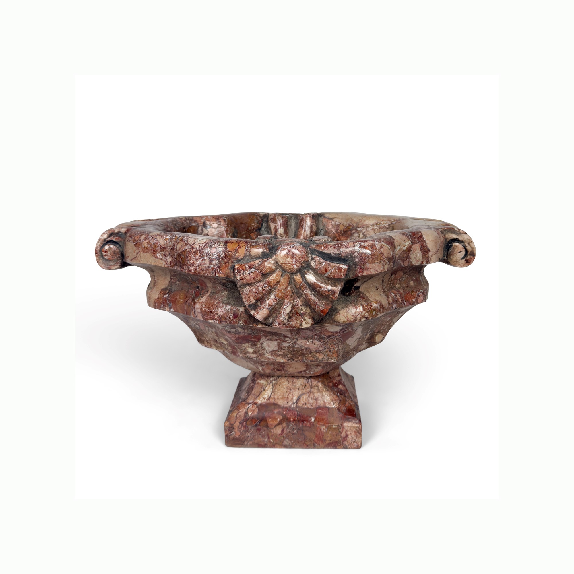 vasca di forma ovale dal profilo centinato scolpita a valve di conchiglia; due prese a voluta; piede rettangolare, cm. 29x49x34