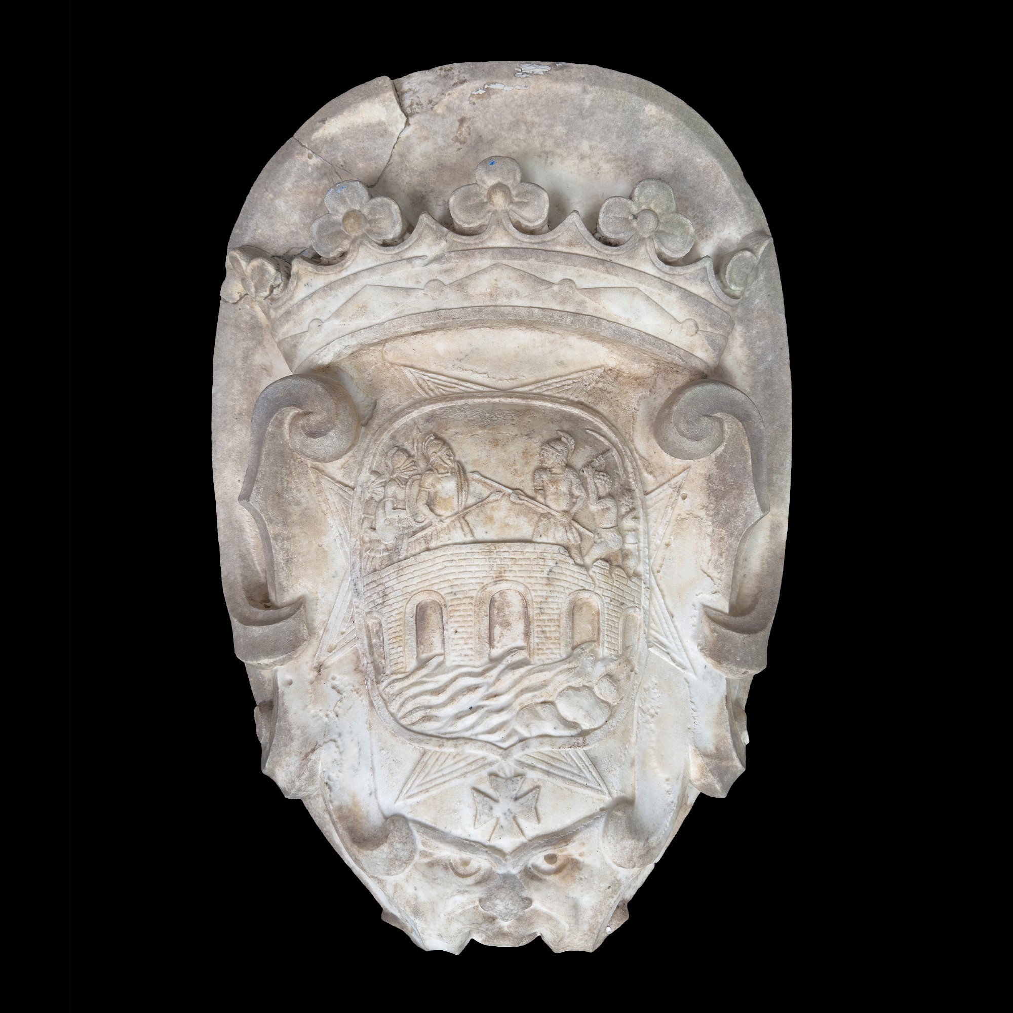 scolpito a medaglione centrale con scena di battaglia su un ponte, concluso inferiormente da un mascherone antropomorfo, cm. 57x41 (qualche restauro)