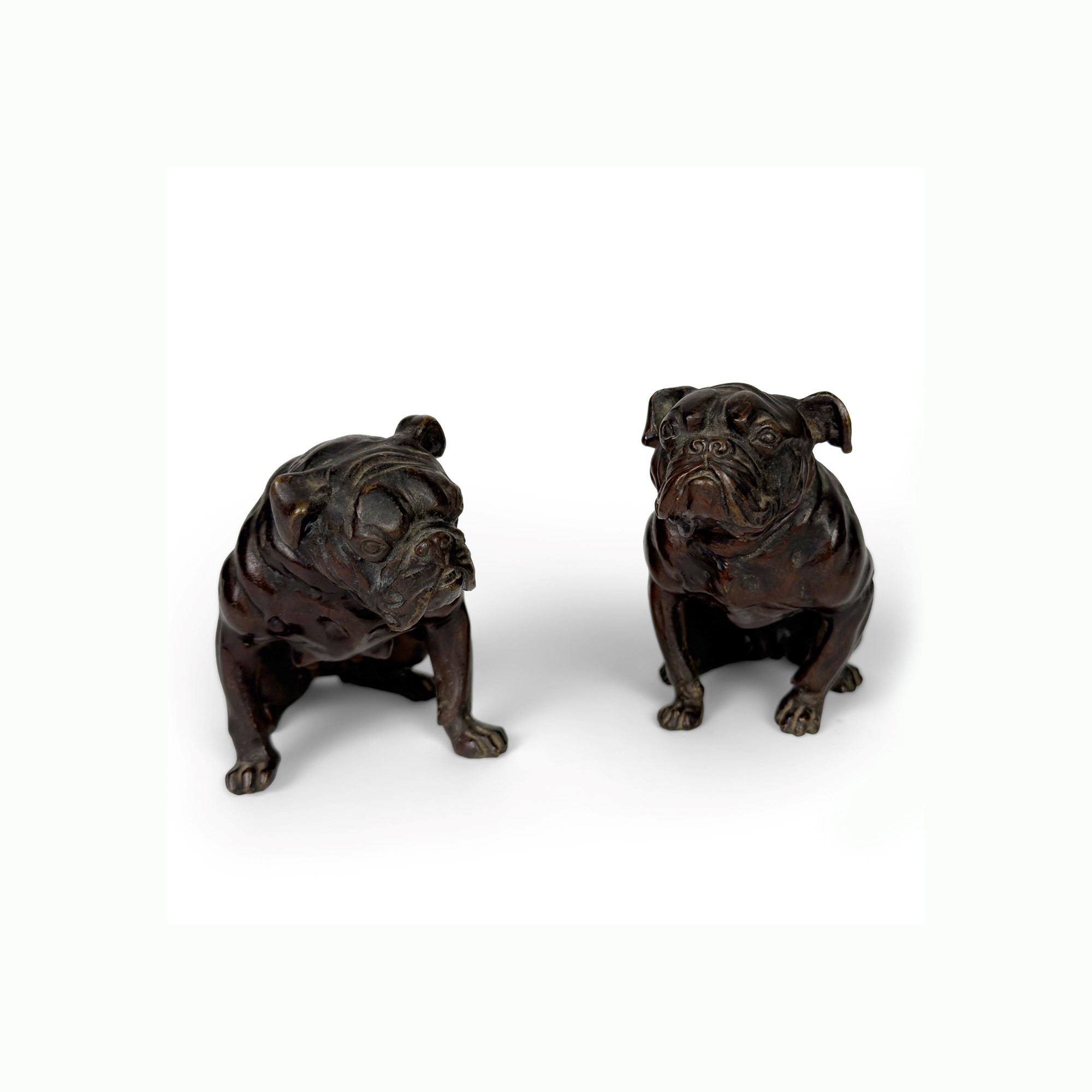 Bulldog accosciati, coppia di piccole sculture in bronzo patinato, XIX secolo