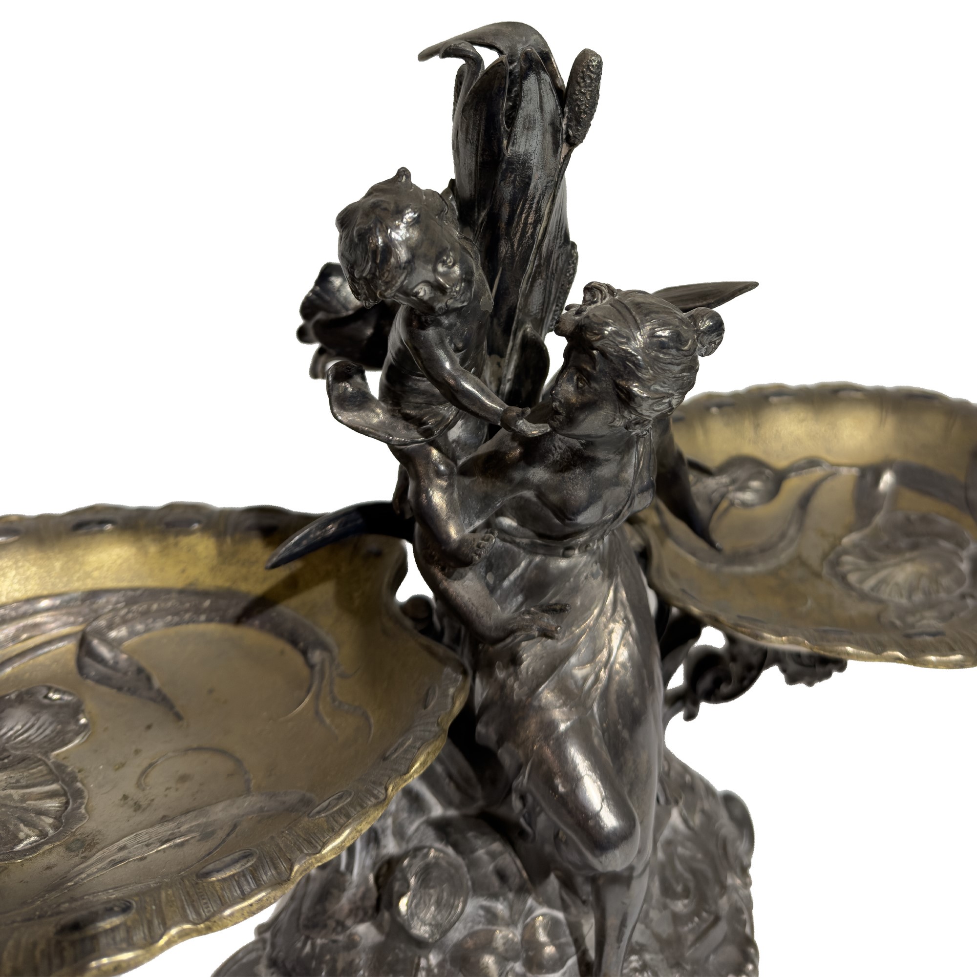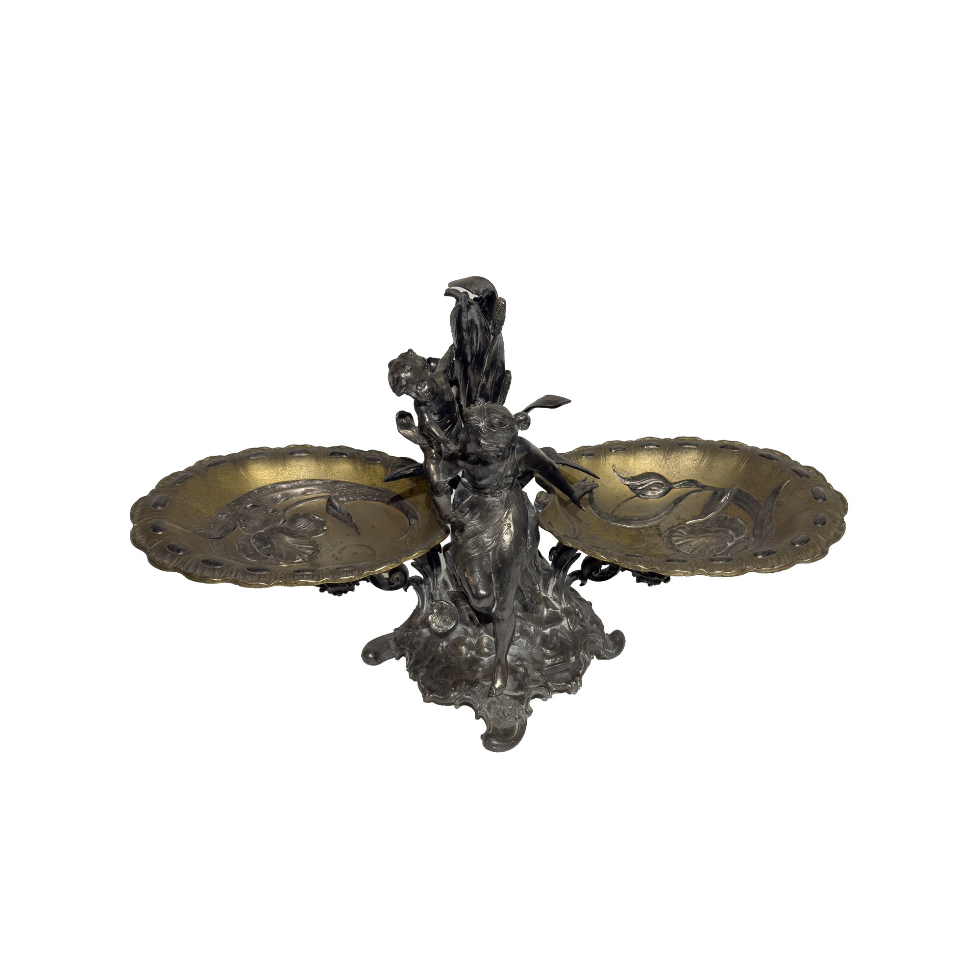 Centrotavola in metallo argentato e dorato, inizi del XX secolo