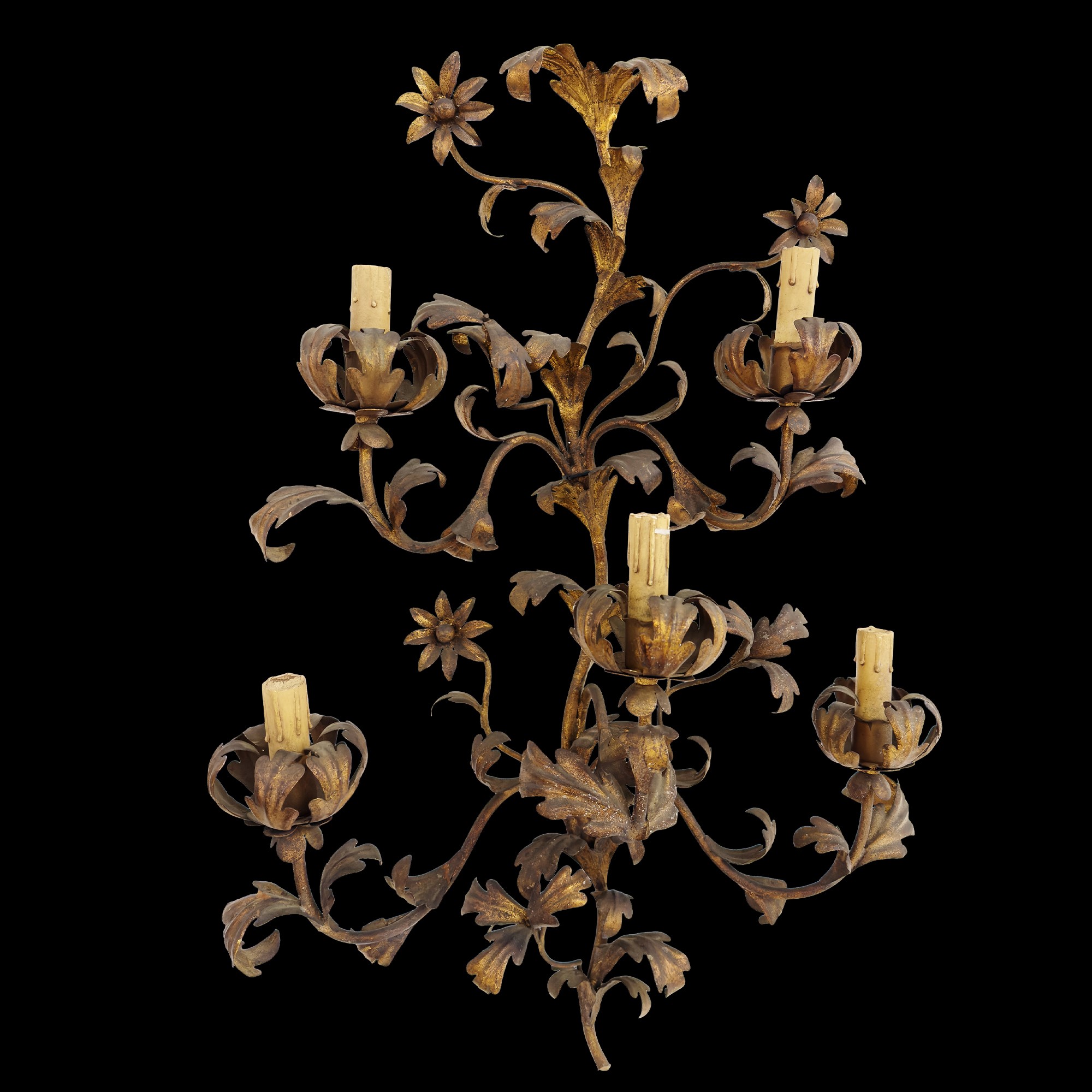 Coppia di appliques a cinque luci in metallo dorato