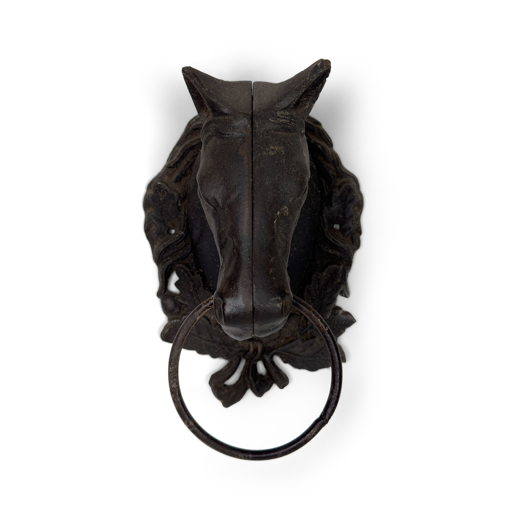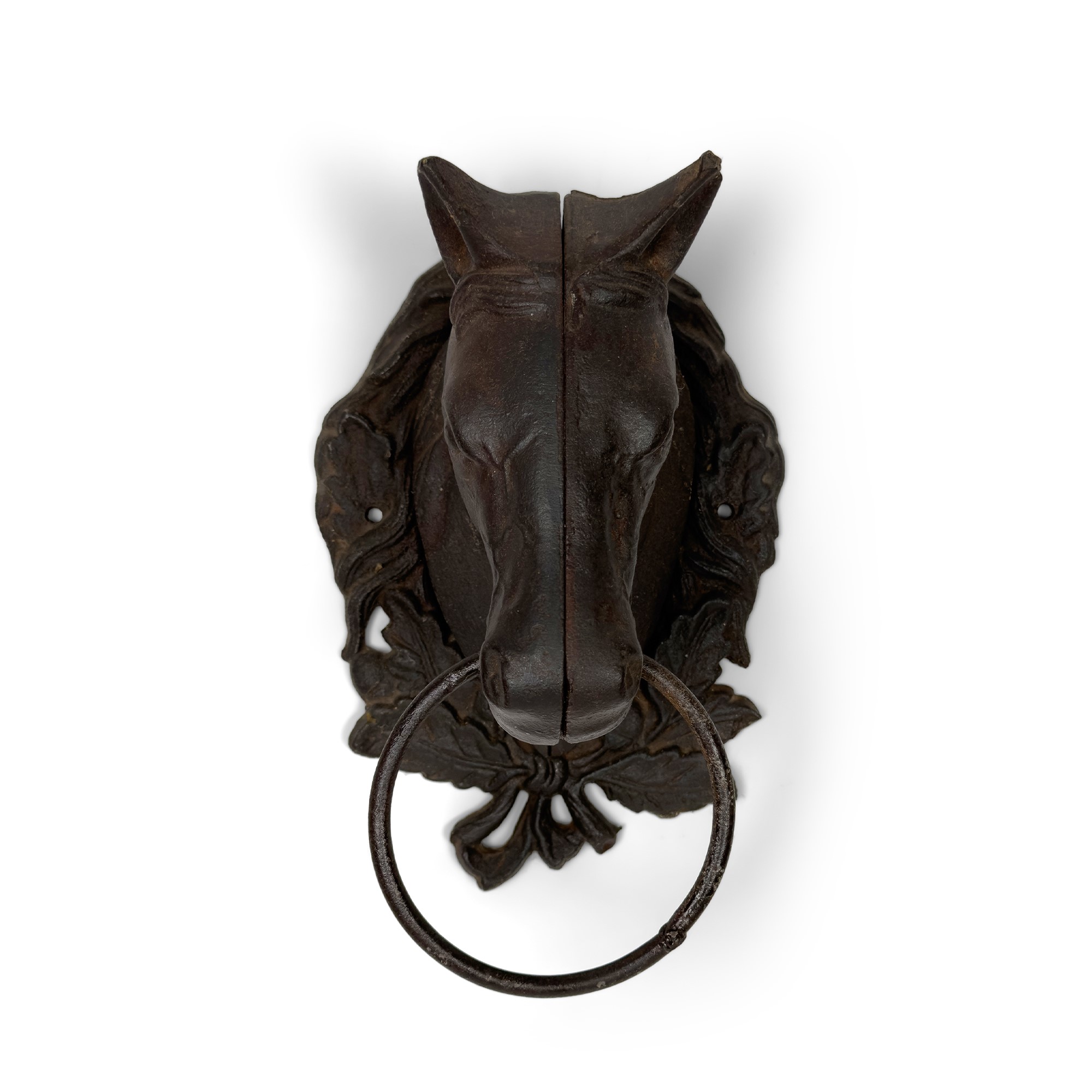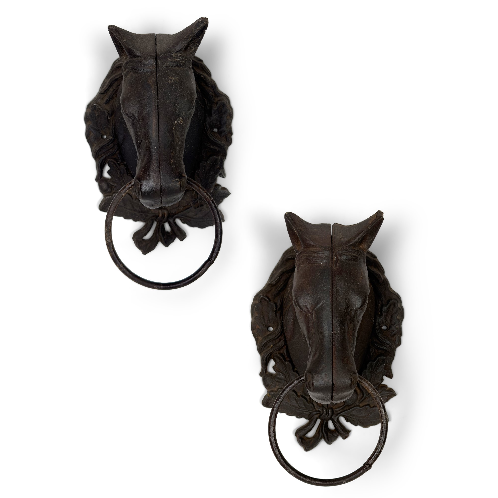 Coppia di battenti da portone in ferro modellati a testa di cavallo