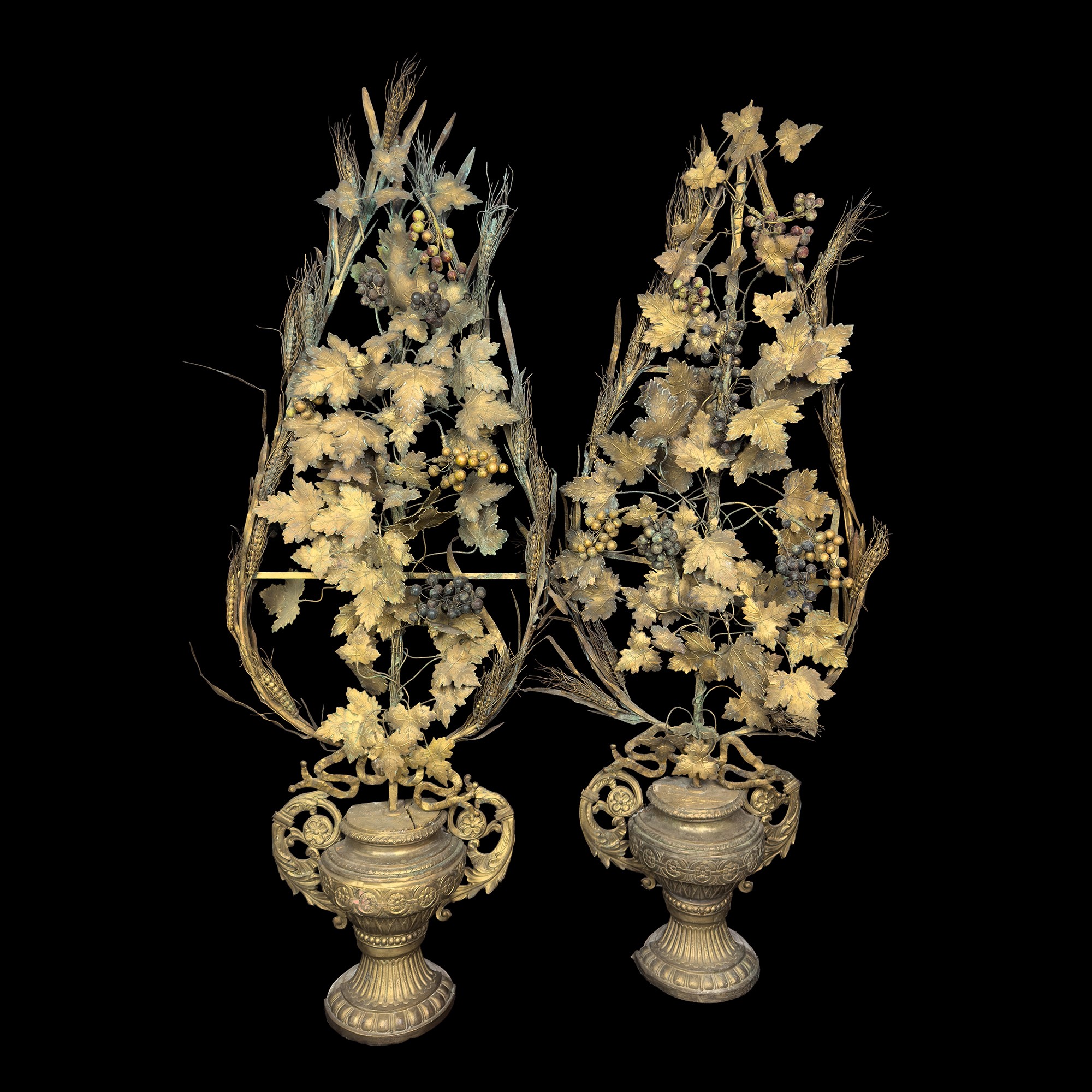 Coppia di decorazioni da altare in legno e metallo patinato e dorato, XIX secolo