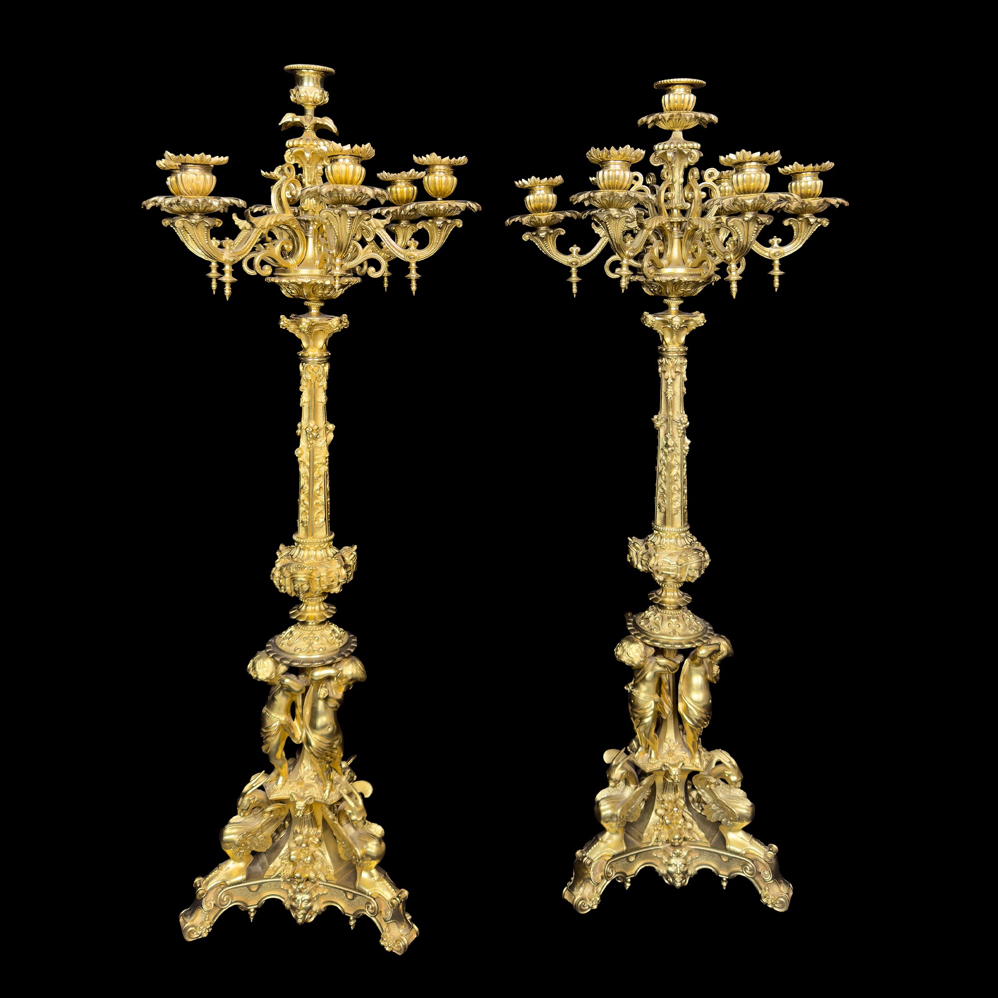 Coppia di flambeaux in bronzo dorato a sei luci, Francia, XIX secolo