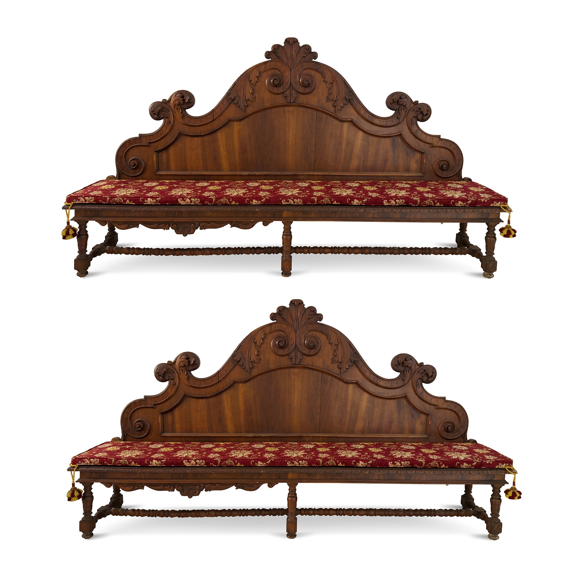 Coppia di grandi panche da androne di noce, Pistoia, XIX secolo, Angiolo Chiti