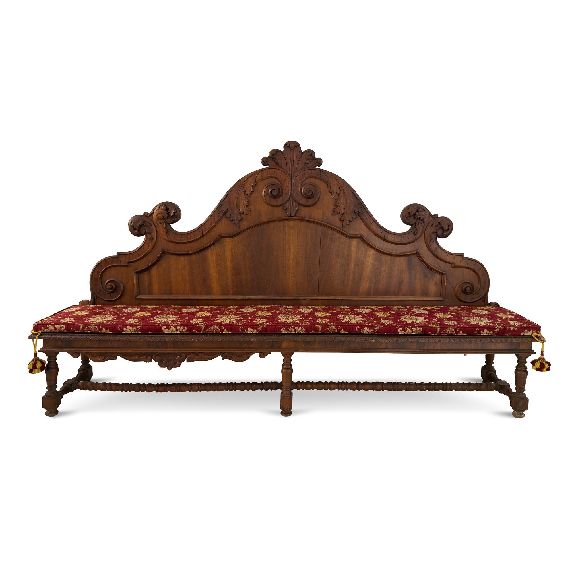 schienale sagomato in parte intagliato a foglie d'acanto; seduta rettangolare; montanti e traverse di riunione a rocchetto. Al verso dello schienale etichetta cartacea: Angiolo Chiti e Figlio Ebanisti Intagliatori Pistoia, cm. 157x280x49