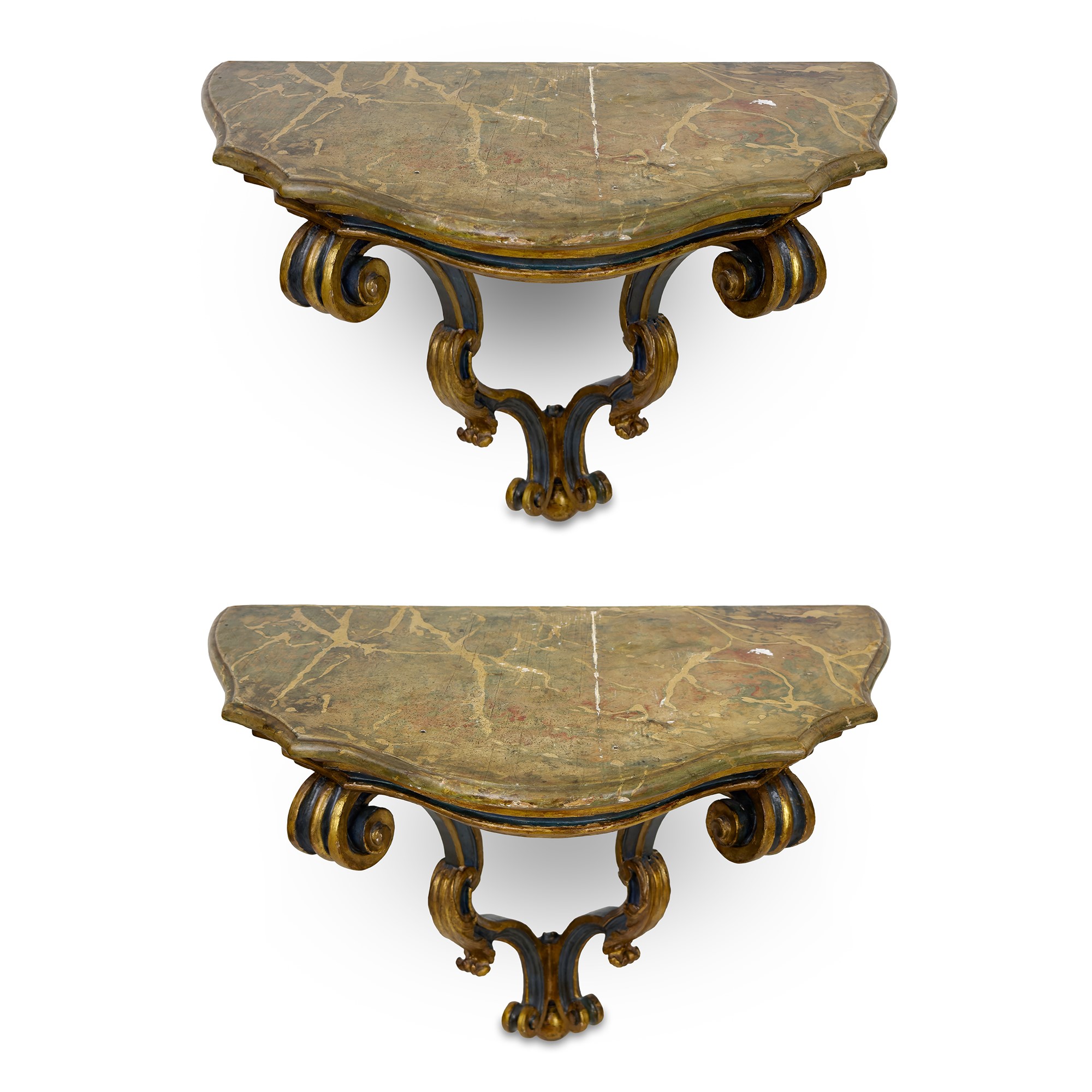 piano a finto marmo dal profilo sagomato; due montanti a voluta riuniti alla base da un elemento sferico, cm. 66x77x43