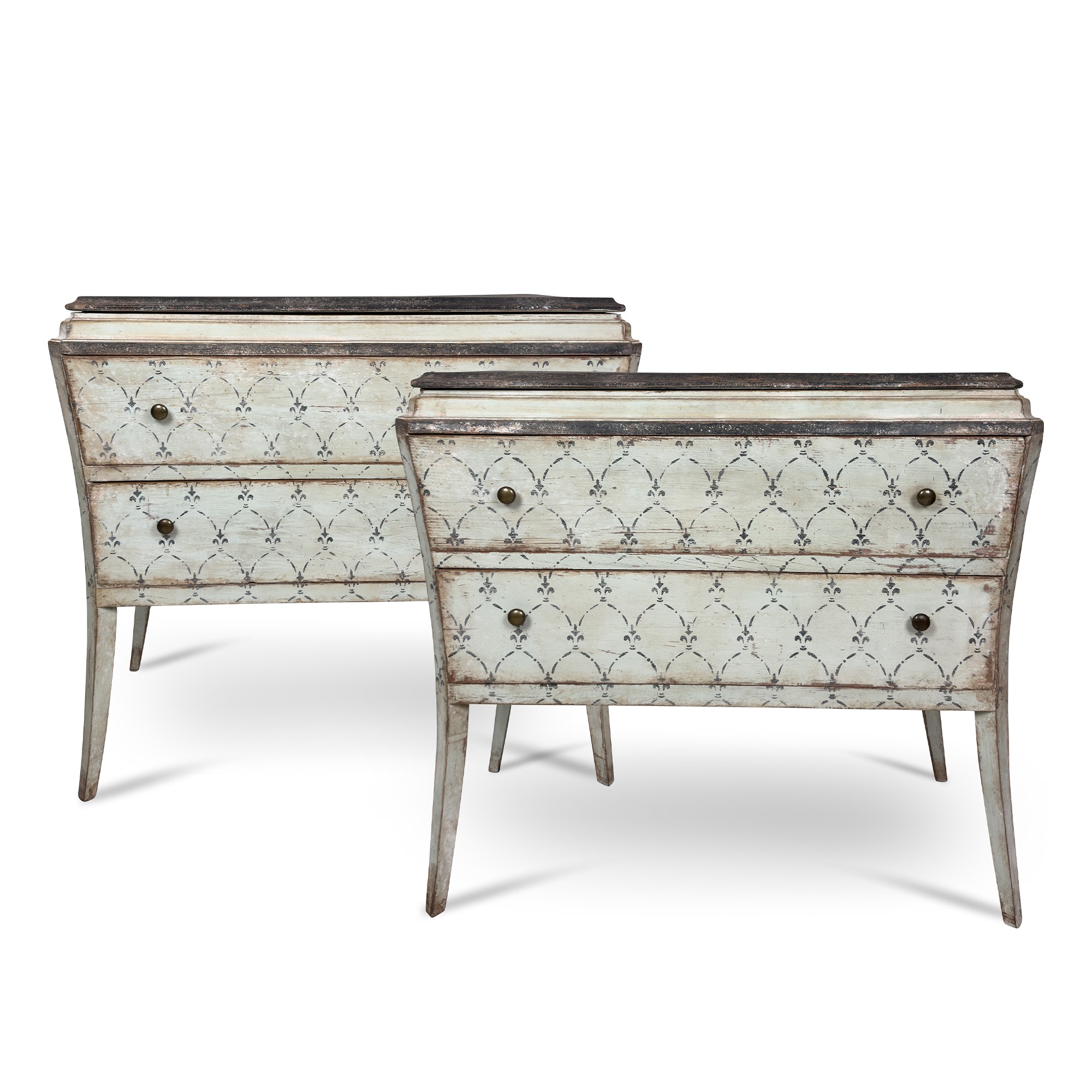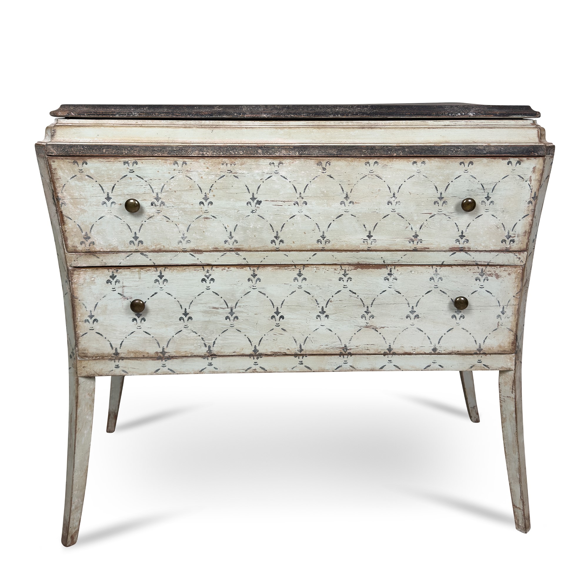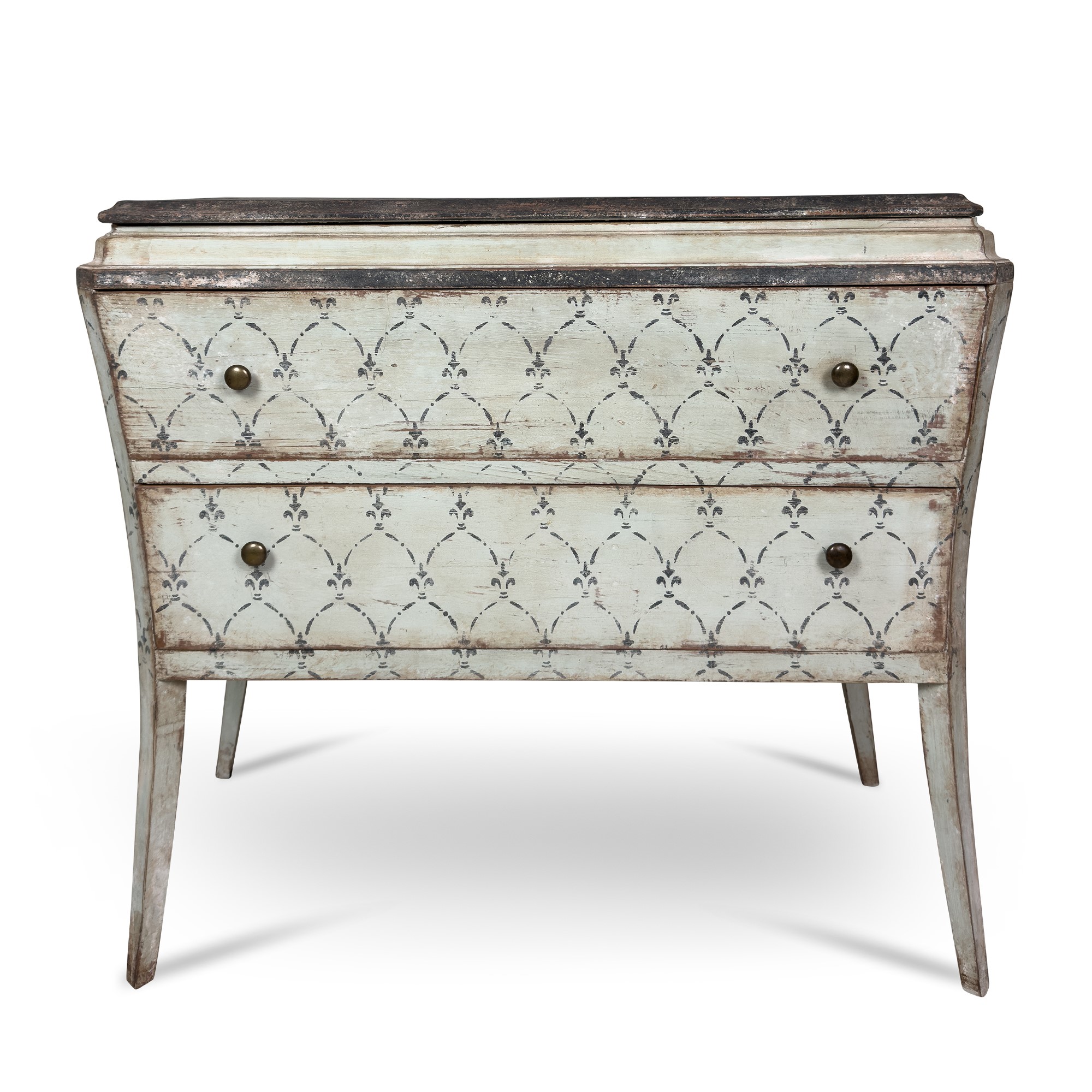dipinti in blu a motivi vegetali stilizzati, di forma parallelepipeda lievemente convessa. Fronte a due cassetti; gambe anteriori di linea eversa; piano dipinto nero, cm. 93x105x51