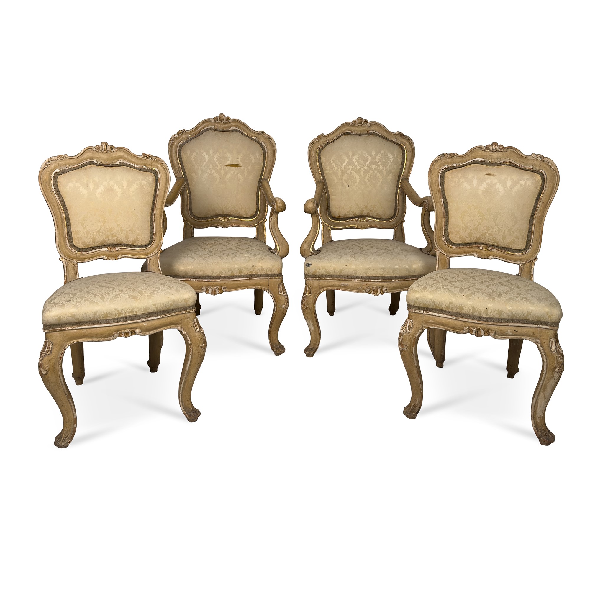 Coppia di poltrone e coppia di sedie in legno laccato avorio e dorato, XIX secolo