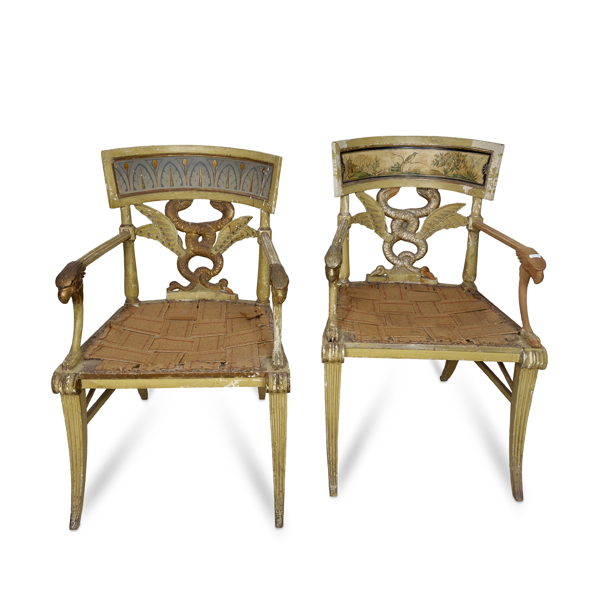 schienale di linea concava intagliato a giorno a figure di due draghi alati dalle spire attorcigliate sormontati da una cartella dipinta in policromia rispettivamente a paesaggio orientale con volatile e a sequenza di foglie lanceolate; braccioli desinenti a testa di rapace su montanti che si concludono in un piede ferino; gambe di linea eversa, quelle anteriori scanalate, cm. 84x55x60 (evidenti difetti e mancanze)